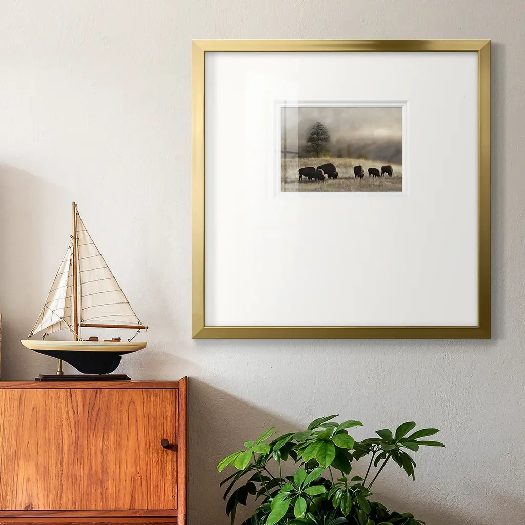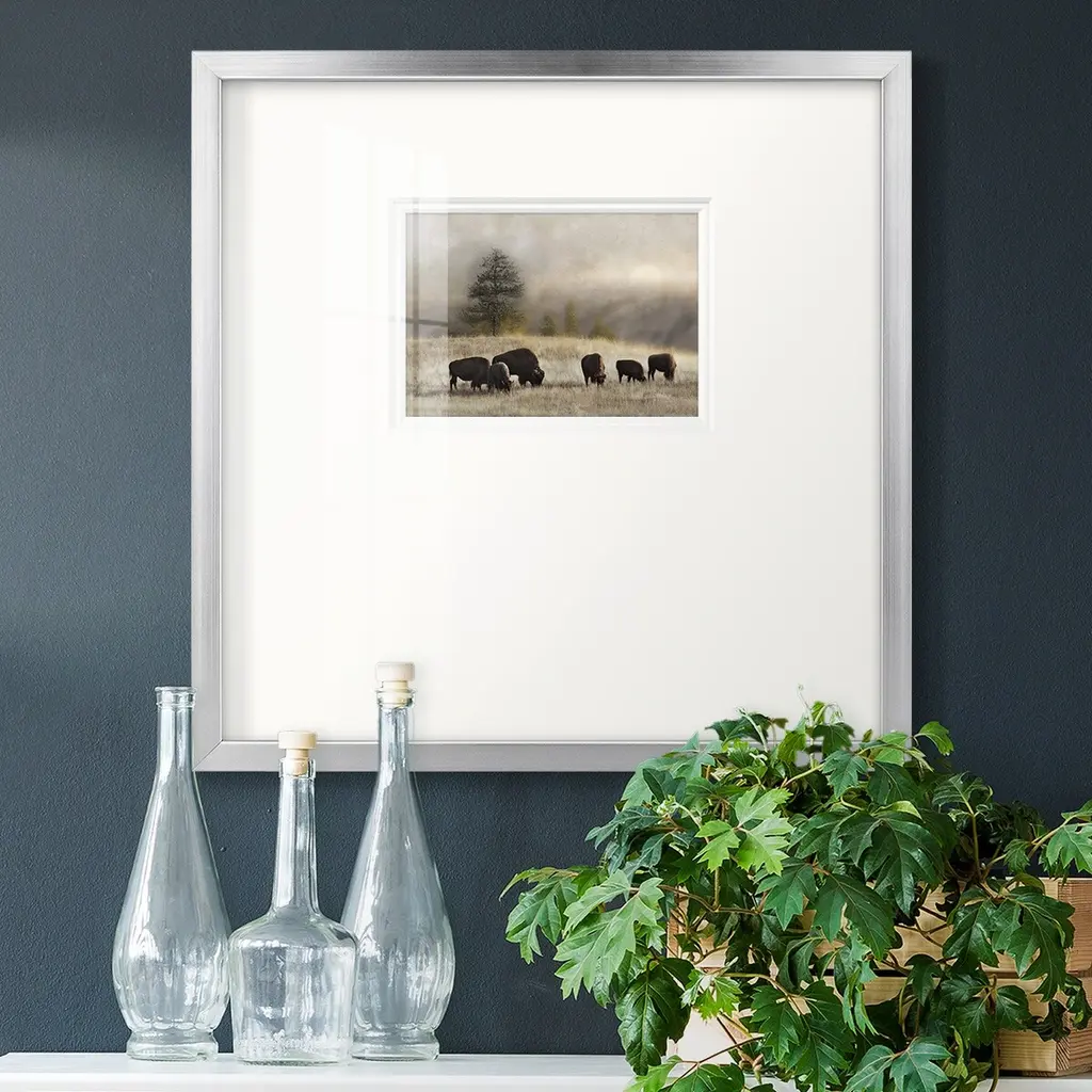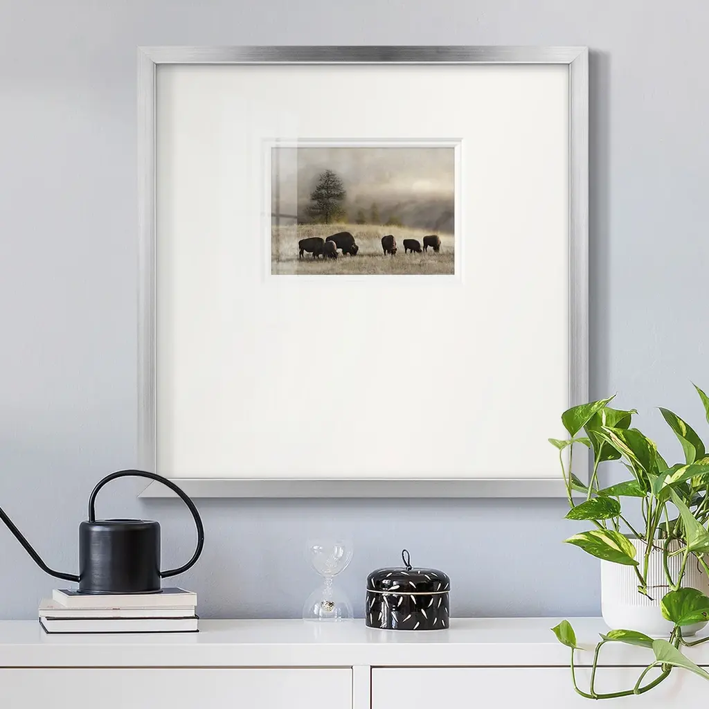 Ridge GrazingPremium Framed Print A framed cold pressed paper print featuring superior double matting and quality frame. 2 SIZES AVAILABLE 16''X16''' - Overall Size 20''X20''' - Overall Size Each piece is made to order. Each piece comes with hanging hardware. Made in the USA Ready to Hang Giclee Paper Print Plexiglass Beveled Matt Board Double Matte Board