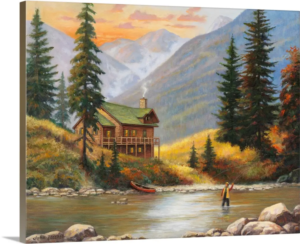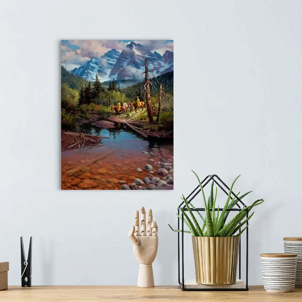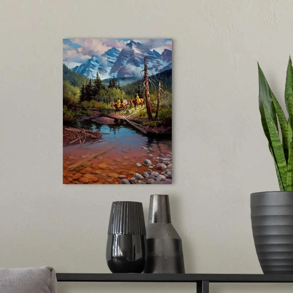 Contemporary Western artwork of cowboys on horseback in the shadow of the Rocky Mountains near a stream.