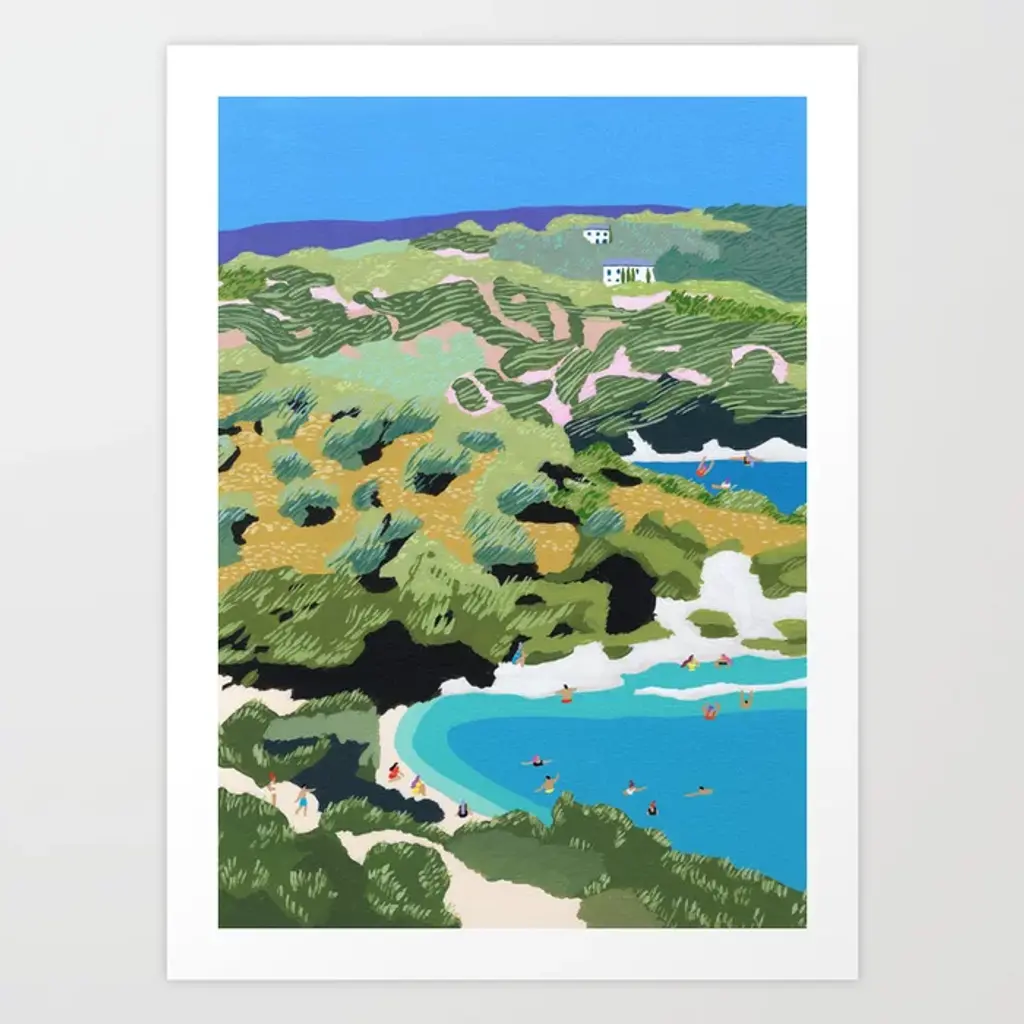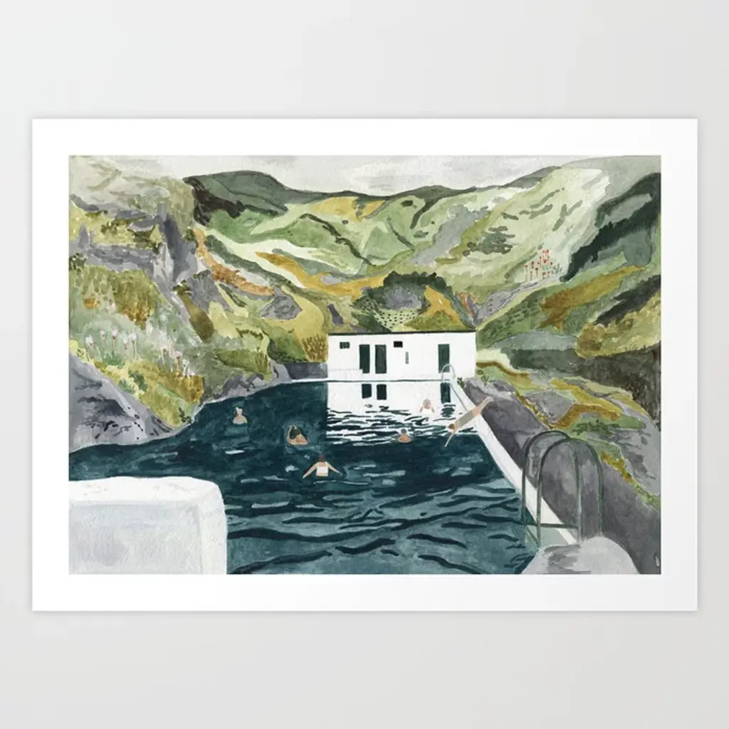 Exhibited in the artist's solo show "Eventi Profondi In Superficie", this singular oil painting on canvas allows the observer to delve into a seeming reality where a waterfall can emerge from the reflection of a lake. Bathers dot the scene, completed by fences and rocks in turn hedged by trees in vibrant shades of green. A stunning addition to elegant modern houses between hills.