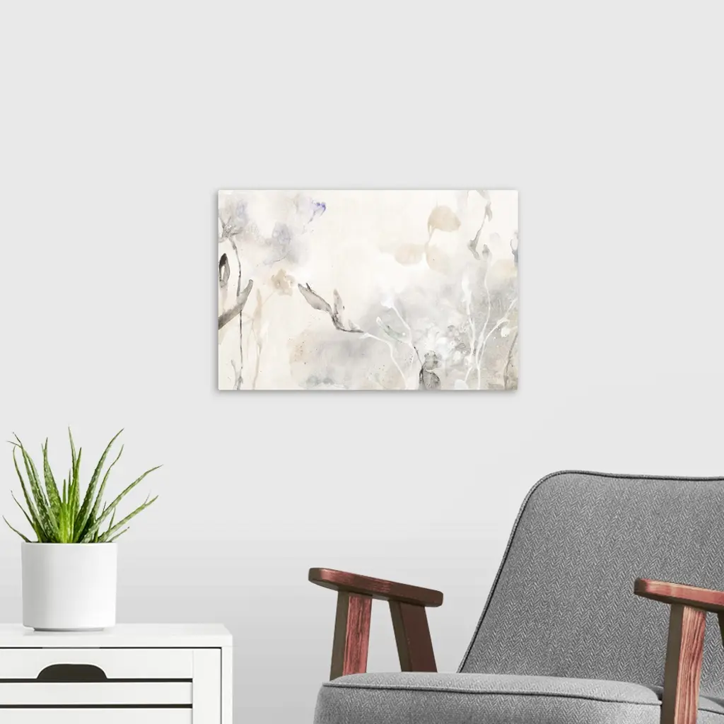 Contemporary abstract painting of several leafy plants in pale grey tones.