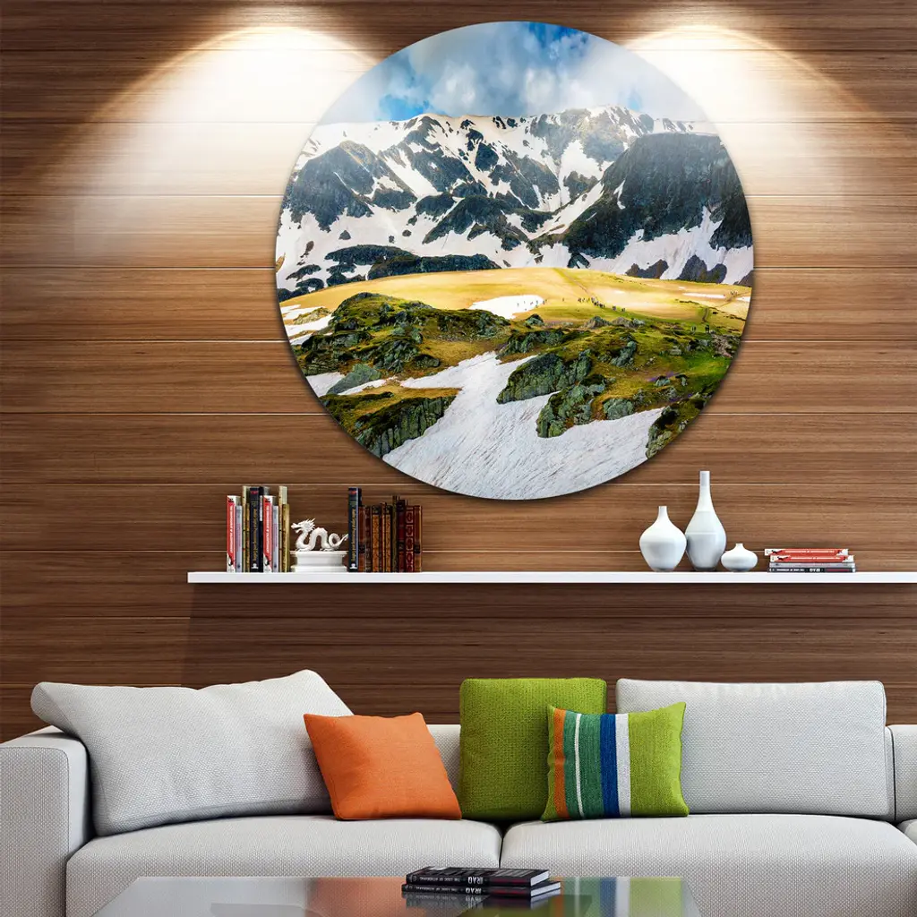 Bring Contemporary Abstraction to your home with this large Circle Metal wall art. This Rila lakes and Mountains in Bulgaria Metal Artwork makes it the focal point of any room or office. - White Gloss Coating ensures colors are extra vibrant with light reflection.- Aluminum grade Sheet Metal with 1 inch mounting frame on the back giving the illusion that the artwork is floating on the wall..- Mounting Brackets are included along with instructions.- High Quality Digital images are created directly into a glossy aluminum panel producing a stunning and captivating print into the glossy finish of the metal.- Water, Fire and Scratch resistant HD Aluminum panels.- Looks better than any photo paper and guaranteed to last at least 20 years- Easy to clean with a microfiber cloth. Colors are far superior to regular Canvas Art. - Easy to Hang