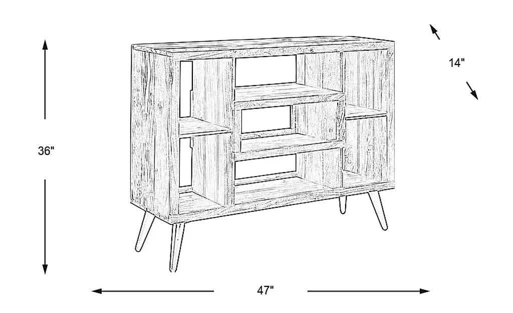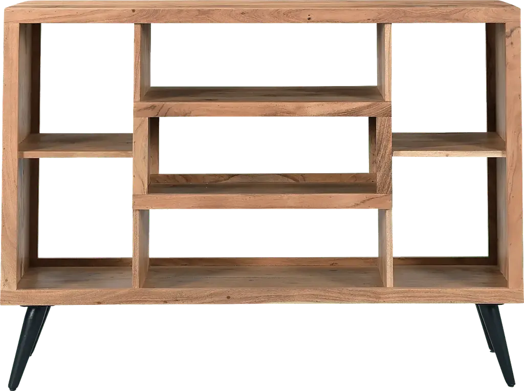 Drawing from mid-century modern style, the Riland credenza offers a wonderful way to showcase your photographs, books and artwork. Its clean lined construction includes seven open compartments plus a spacious top shelf. Crafted of acacia wood, this piece is rendered in a natural sandstone finish. Select levelers are adjustable, allowing you to customize your storage space. Tapered metal legs in a black finish are angled to create a retro-inspired look.