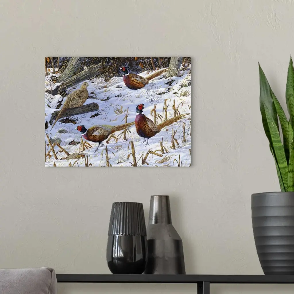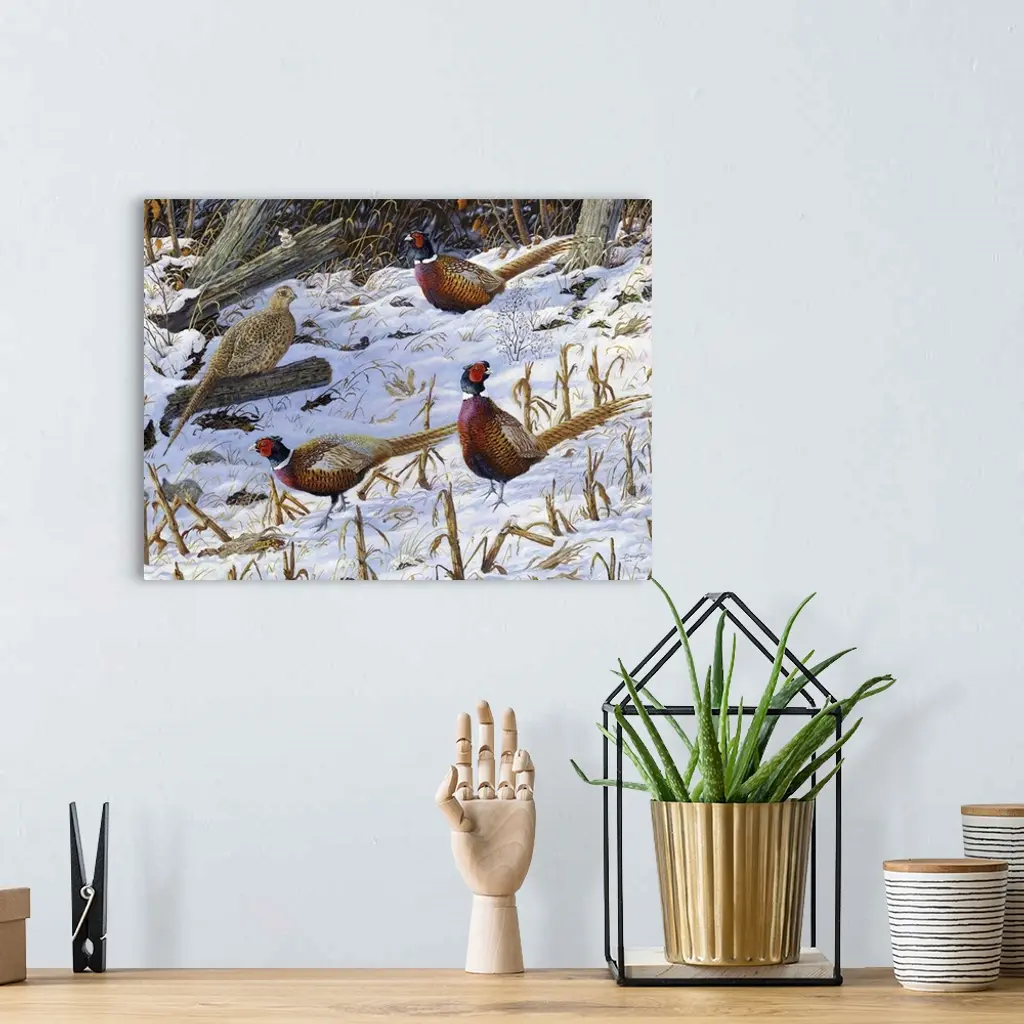Contemporary artwork of a flock of pheasants foraging in the snow.