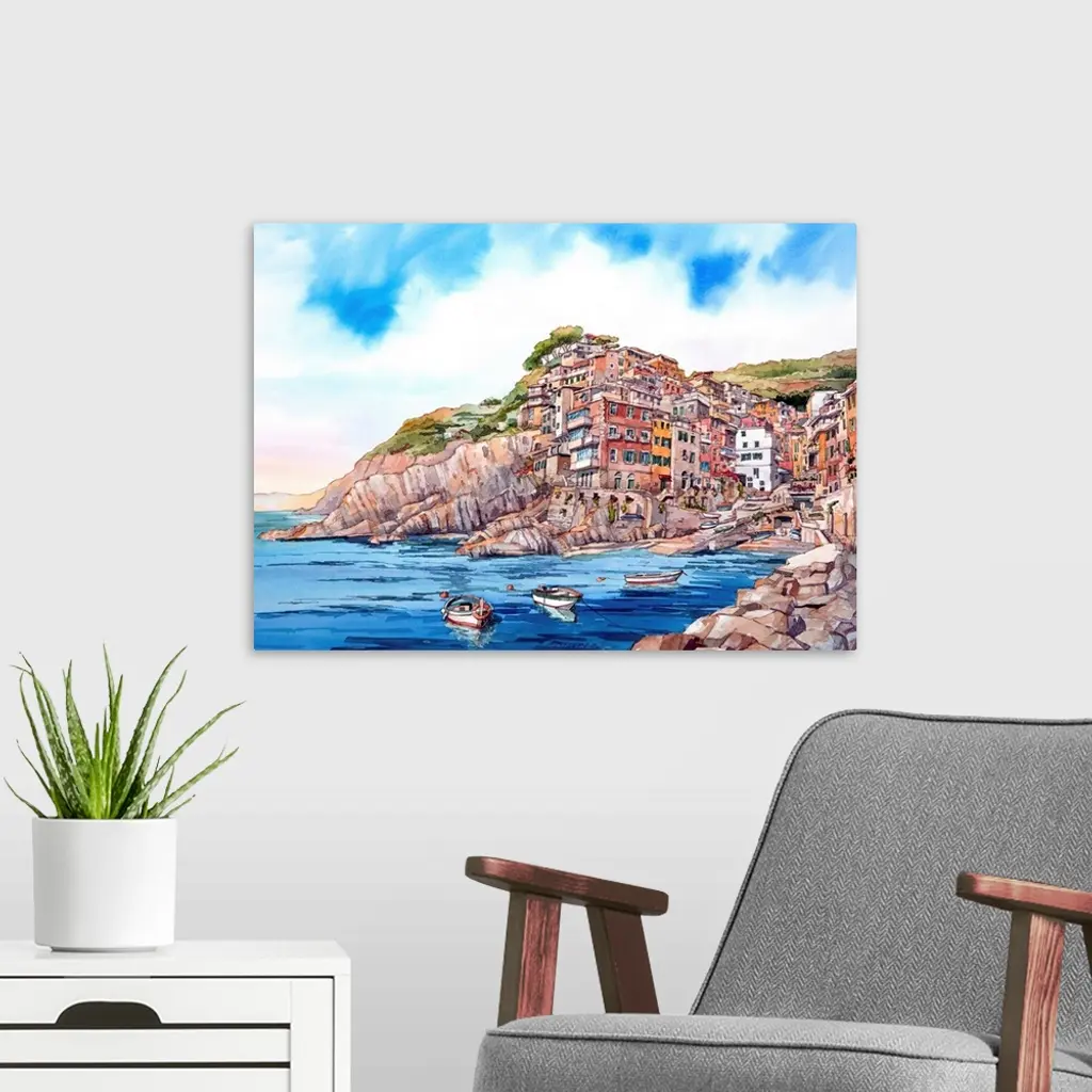 Watercolor painting of the village of Riomaggiore in Cinque Terre, Italy, with boats anchored in the foreground.