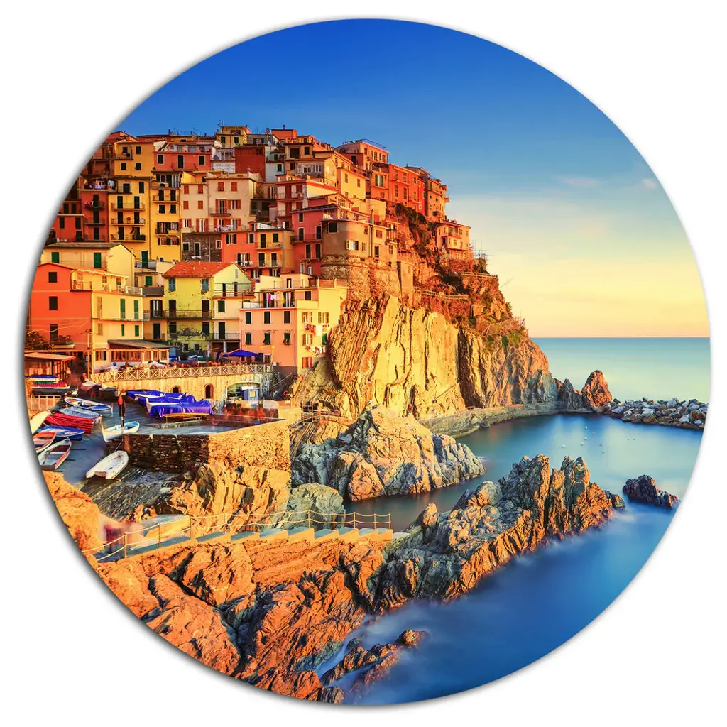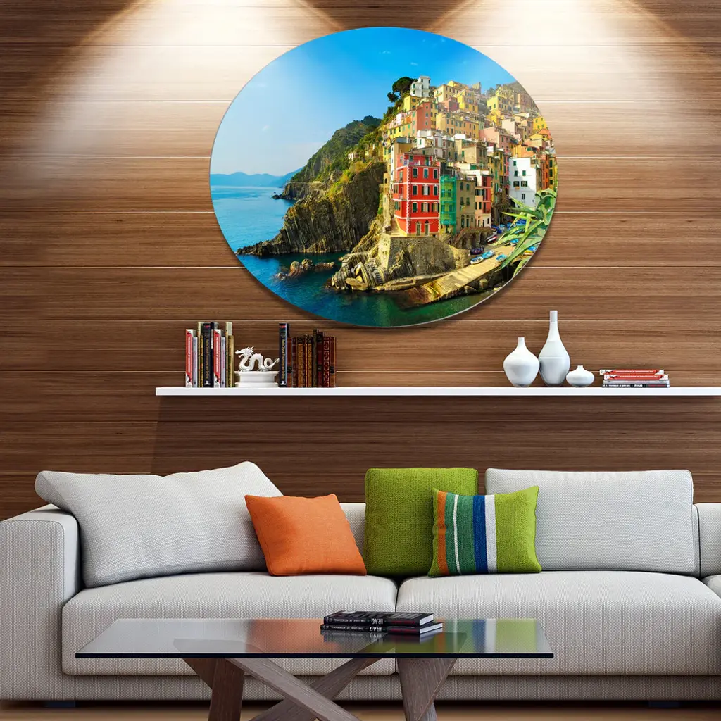Bring Contemporary Abstraction to your home with this large Circle Metal wall art. This Riomaggiore Village Rocky Beach Metal Artwork makes it the focal point of any room or office. - White Gloss Coating ensures colors are extra vibrant with light reflection.- Aluminum grade Sheet Metal with 1 inch mounting frame on the back giving the illusion that the artwork is floating on the wall..- Mounting Brackets are included along with instructions.- High Quality Digital images are created directly into a glossy aluminum panel producing a stunning and captivating print into the glossy finish of the metal.- Water, Fire and Scratch resistant HD Aluminum panels.- Looks better than any photo paper and guaranteed to last at least 20 years- Easy to clean with a microfiber cloth. Colors are far superior to regular Canvas Art. - Easy to Hang