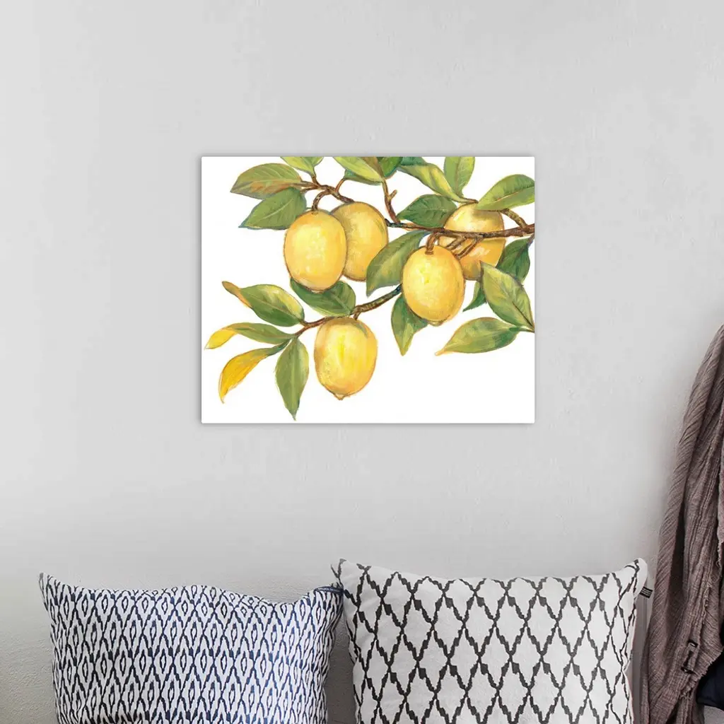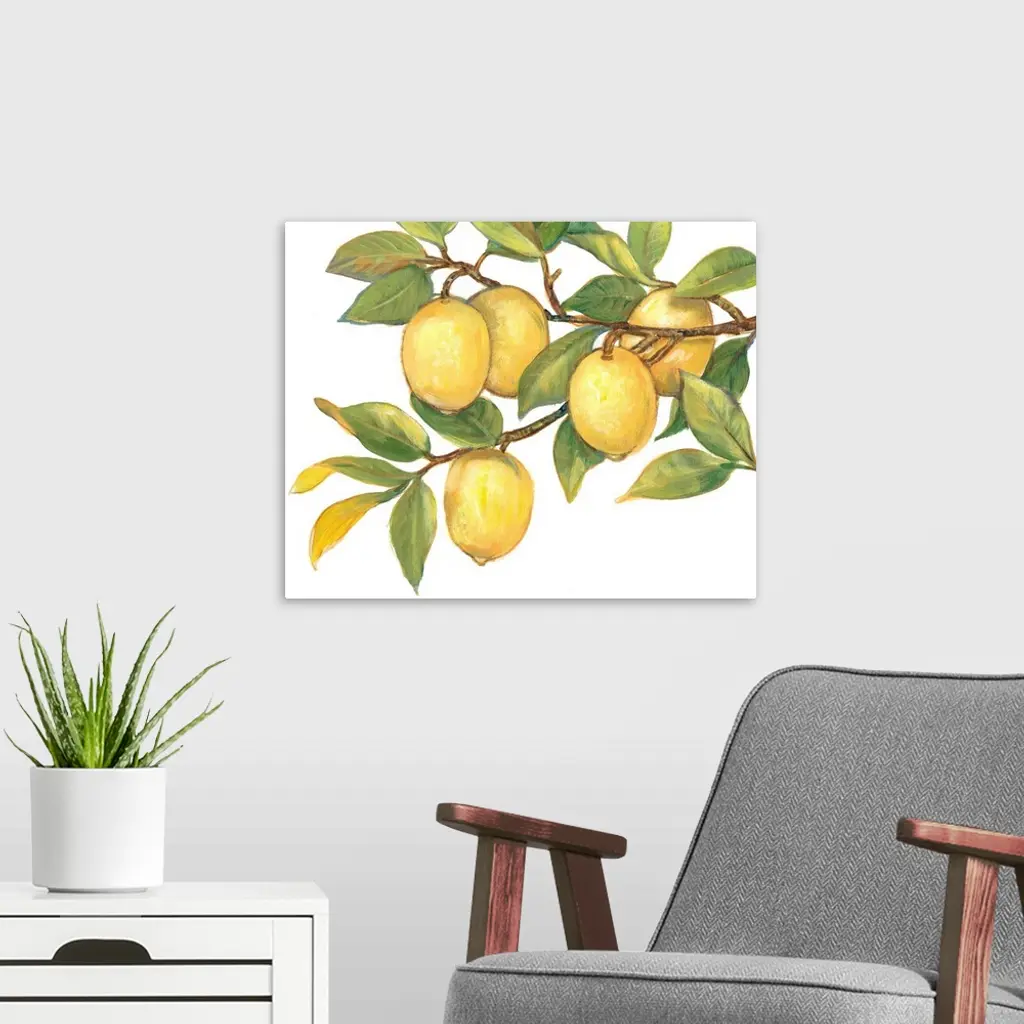 Contemporary painting of ripe lemons hanging from a tree branch.