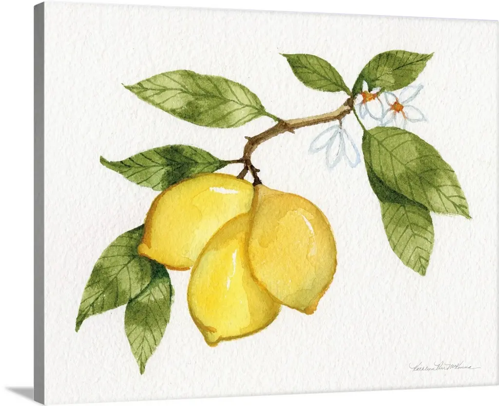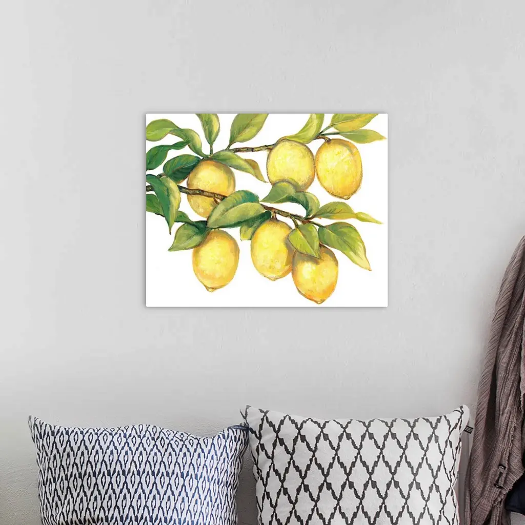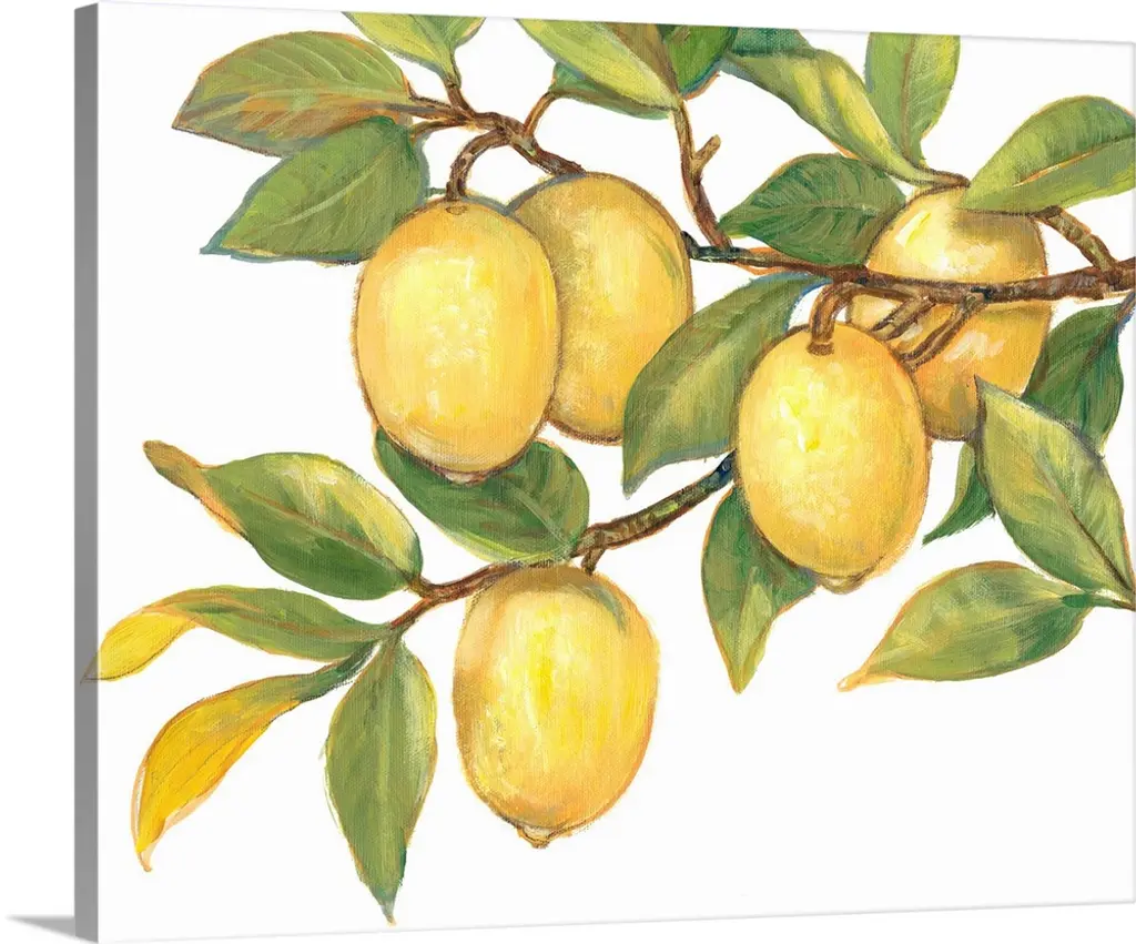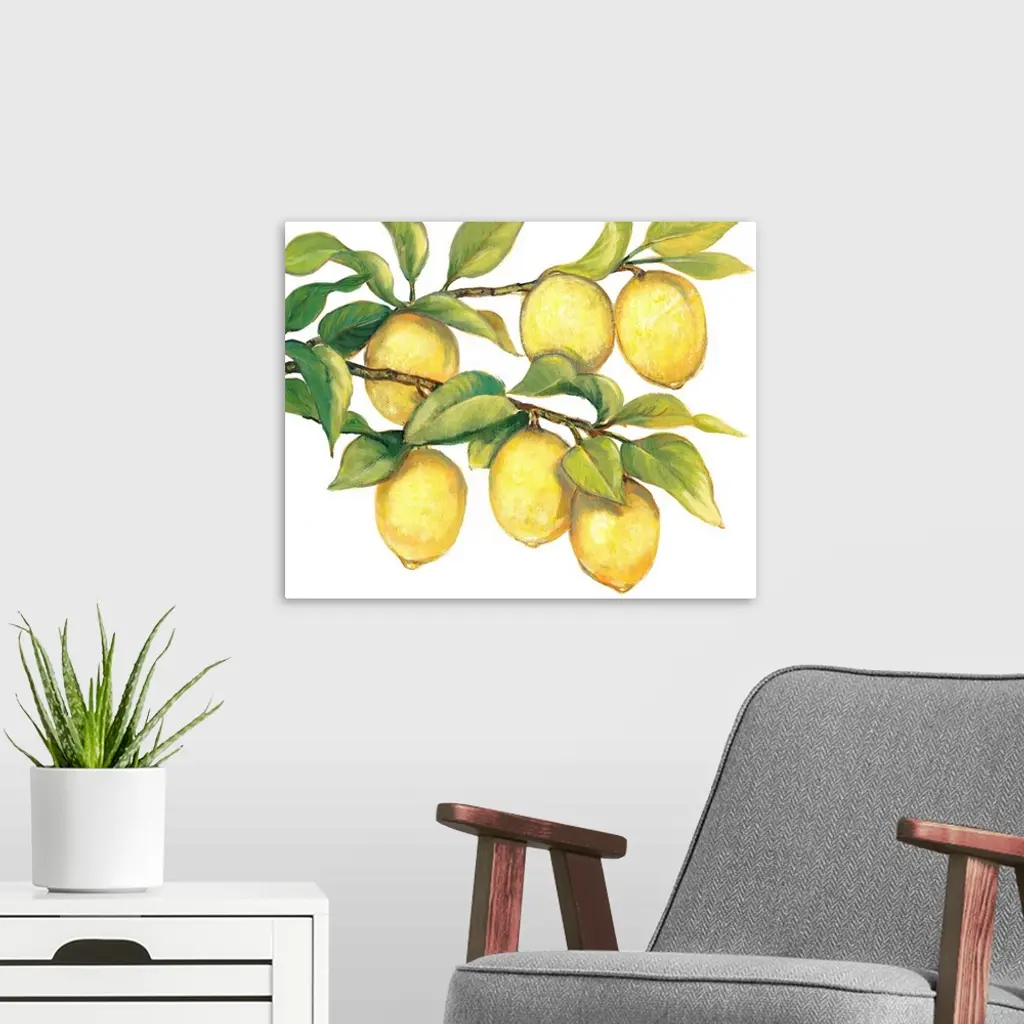 Contemporary painting of ripe lemons hanging from a tree branch.