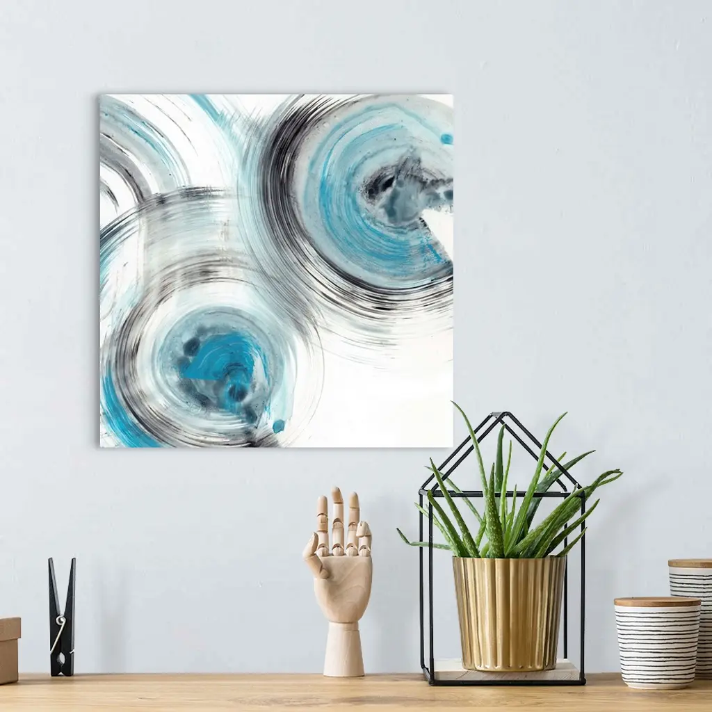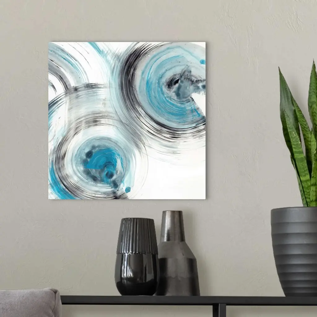 Contemporary abstract painting of circular forms in blue and black reminiscent of the ripple effect of water.