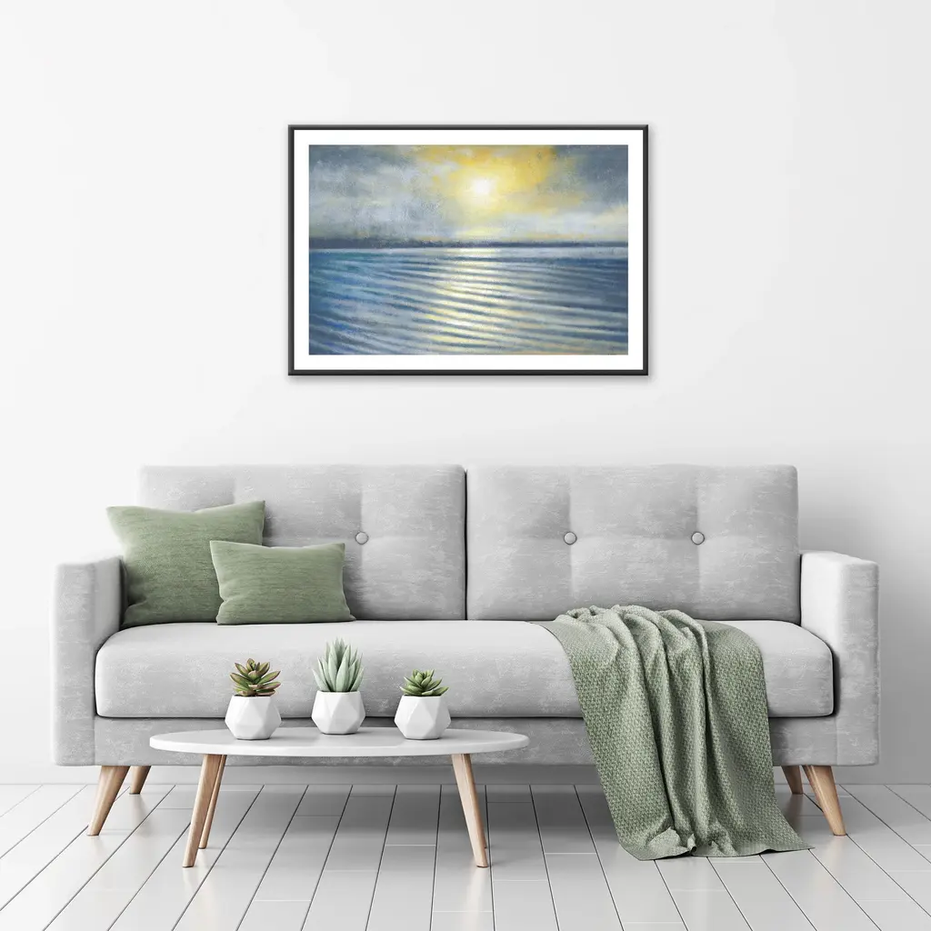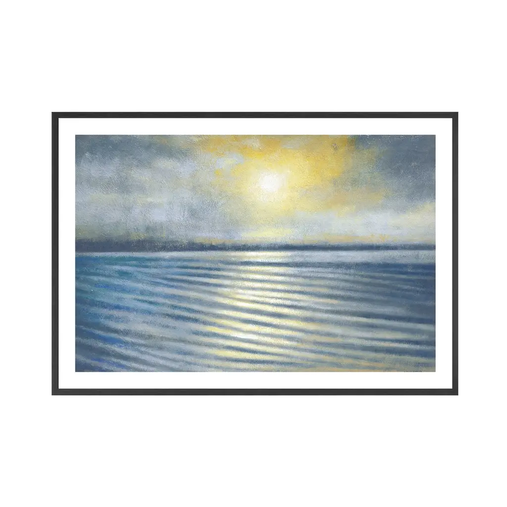 Soothing sensation is reached in 'Ripples by Norman Wyatt Jr. The undemanding blue tones of the expansive sky and the yellow sunburst of light radiates throughout the panels as rays' rest delicately upon the harmonizing cerulean coast. The horizontal decorative artwork will complement your space with its transitional and coastal aesthetic. This piece is handcrafted in Chattanooga, Tennessee by Ready2HangArt using a locally sourced artist print, with a frame and a rear hanger for simple installation. Offering a wide range of transitional subjects and unique textures, Norman Wyatt's collections will add interest to any modern or contemporary decor.
