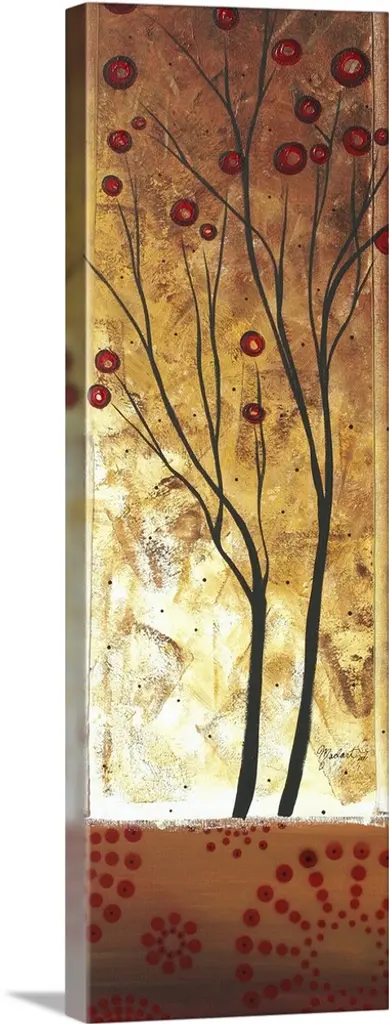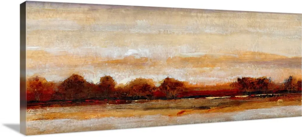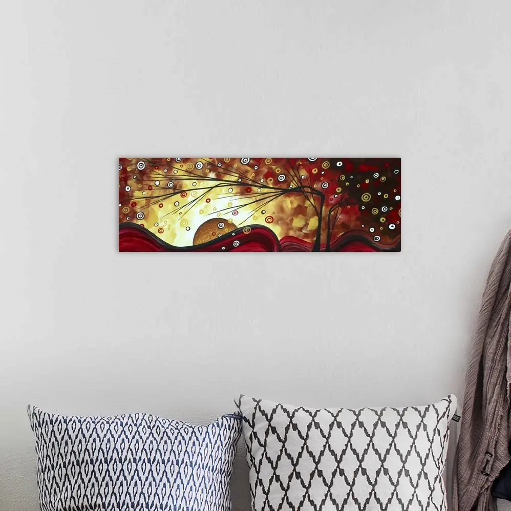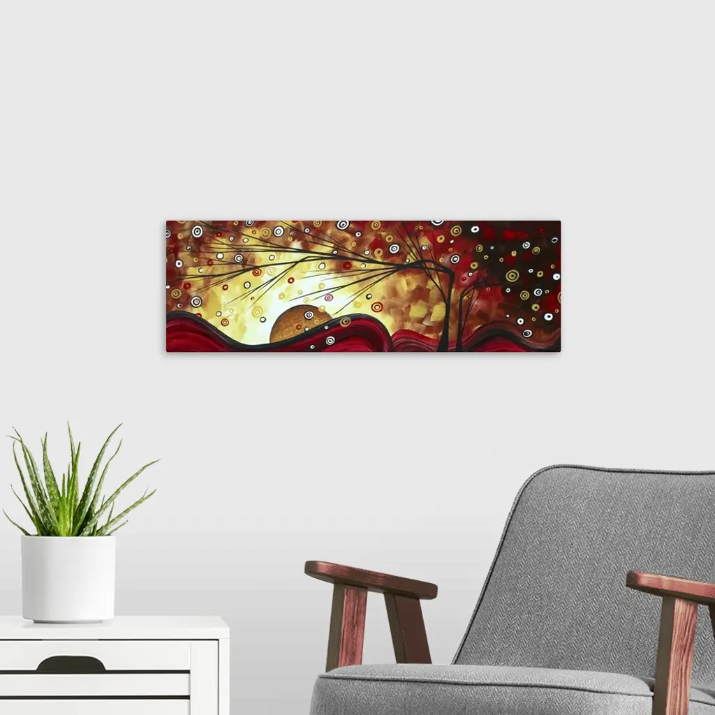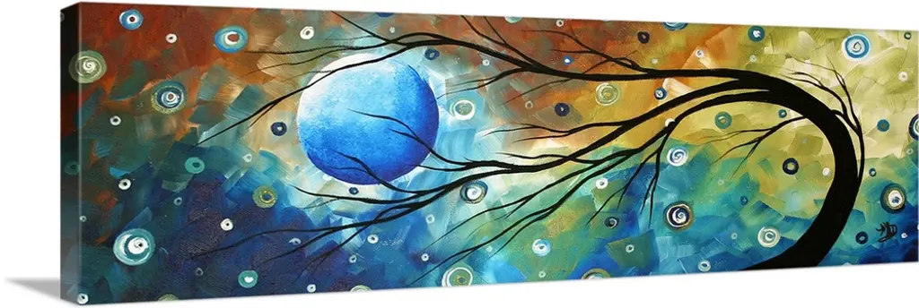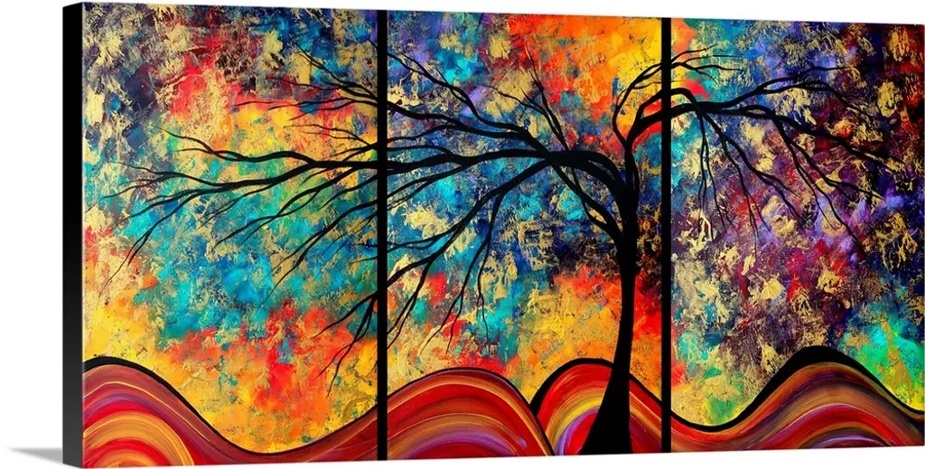 Contemporary abstract panoramic artwork of tree silhouettes surrounded by multicolored circles varying in size.