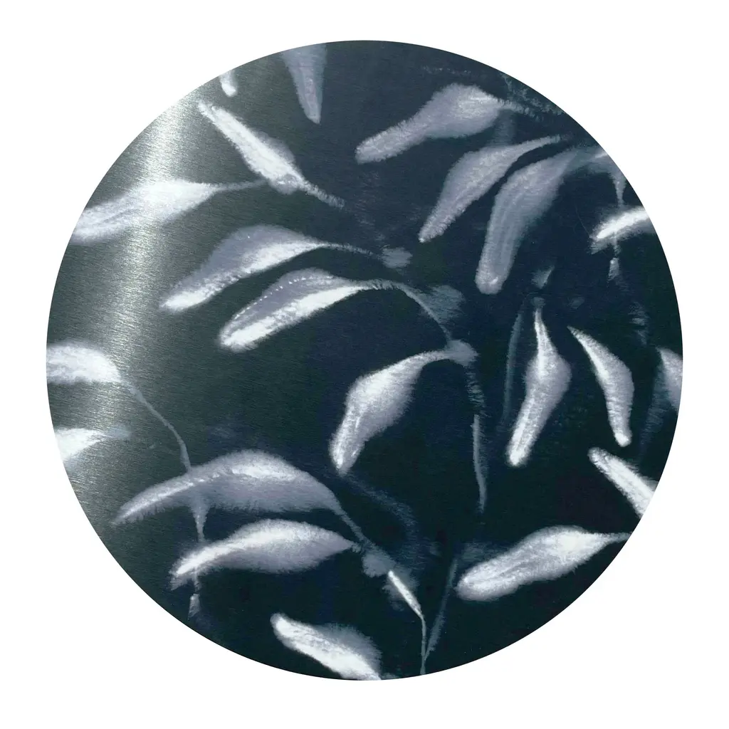 Artwork by Janet Van Arsdale printed with UV inks to high quality 1/8" thick brushed aluminum Dibond with a gloss UV/Anti-graffiti coating. 4 holes drilled for standoff hardware. Signature in the image. Includes Set of 4 1"D x 1"H Barrel aluminum stando