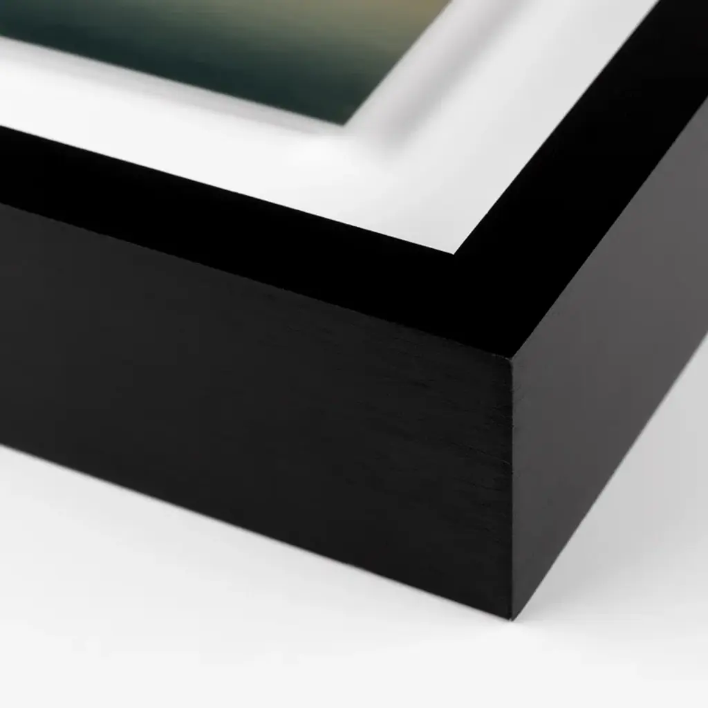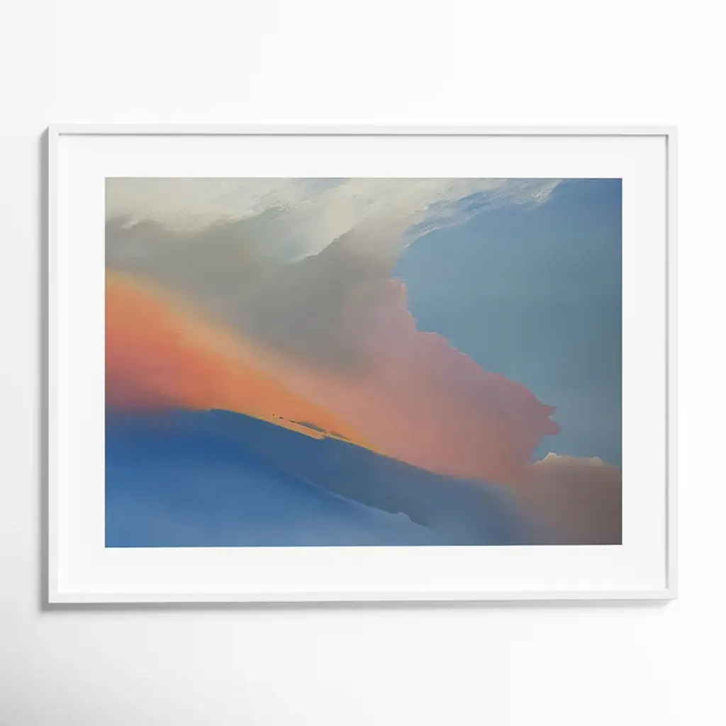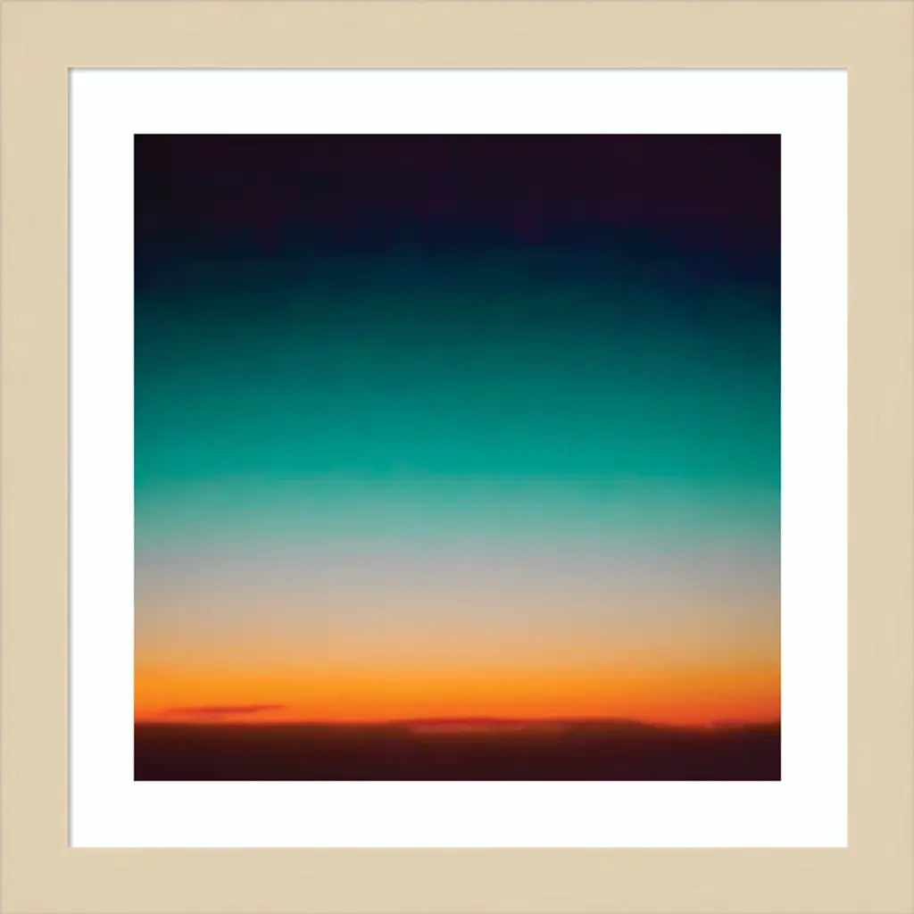 A reproduction of work by painter Ericka Wolf, this print depicts a luminous nautical horizon at dawn. The scene is portrayed with an intentional simplicity that veers toward abstraction, drawing inspiration from color-field paintings and photography with a focus on transience + light. This piece is printed on paper and arrives in a solid wood floater frame with included hanging hardware.