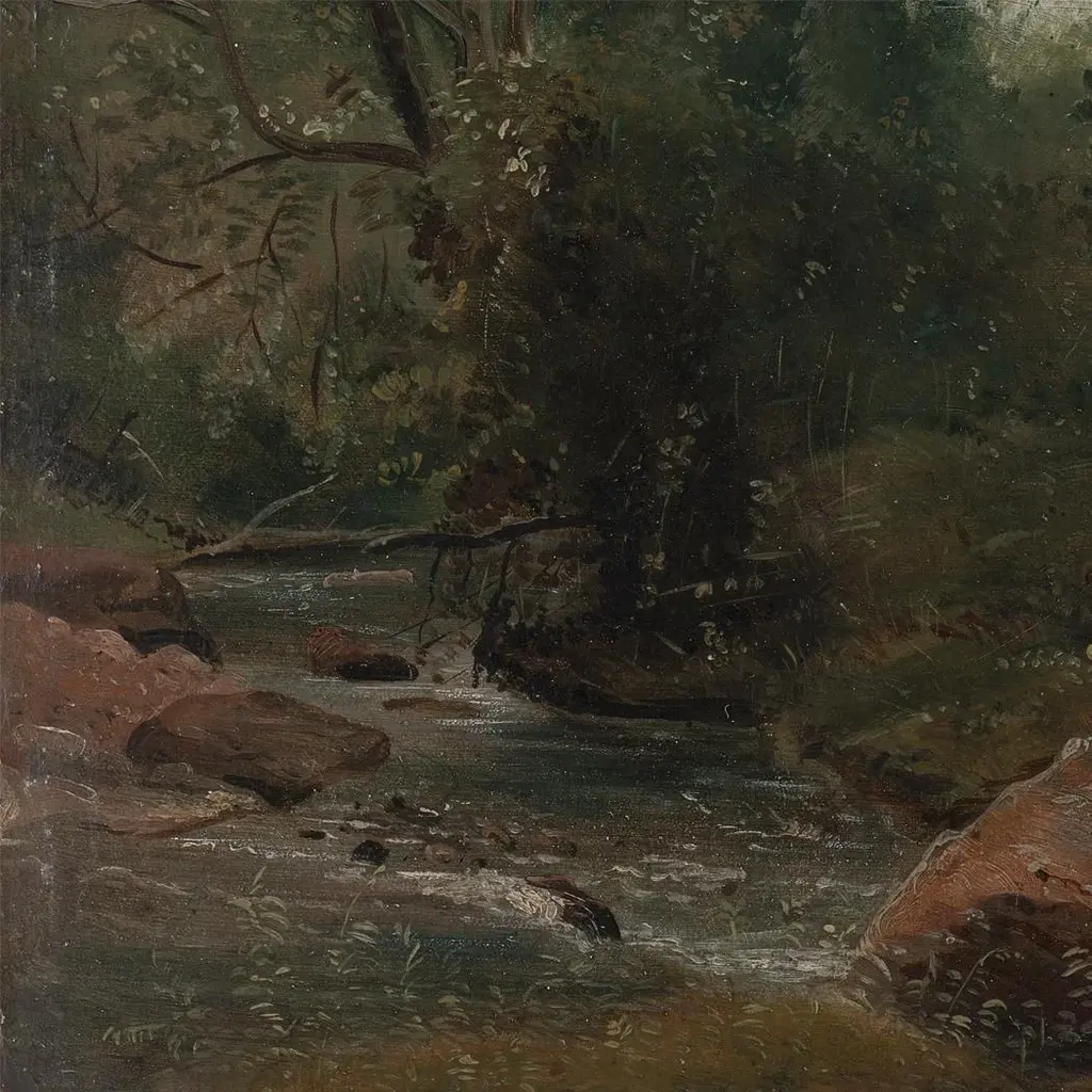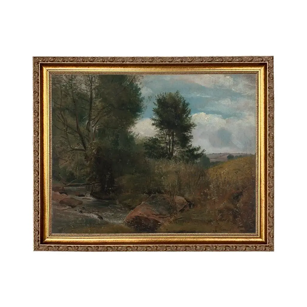 Accurately printed from the original work by English painter Lionel Constable (1828-1887), this image is printed on canvas, mounted to a board and treated with a historic looking varnish. Framed in a thin gold wood frame, the back is finished with craft paper and a sawtooth hook. Made in the USA. • Painting print: 11" x 14" • Finished frame size: 13" x 16" • Frame width: 1-1/4" • Frame thickness: 1"