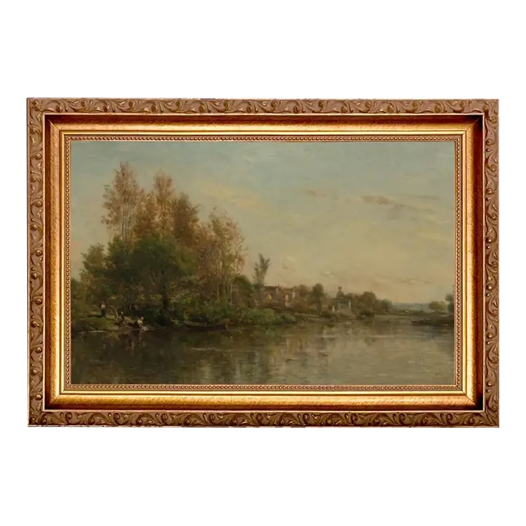 "River And Trees" Landscape Print On Canvas In Thin Gold Frame