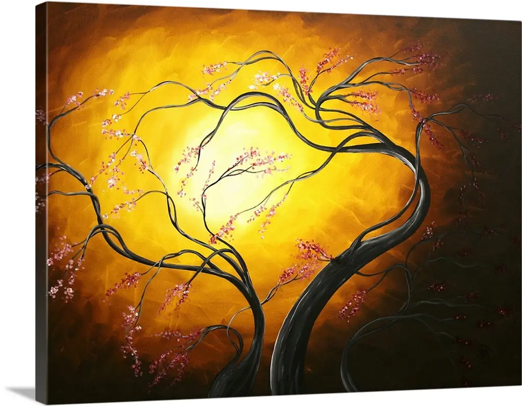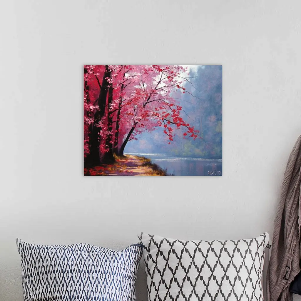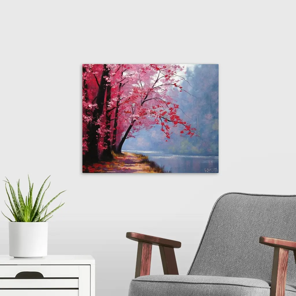 Contemporary painting of an idyllic countryside river scene, with pink autumn foliage.