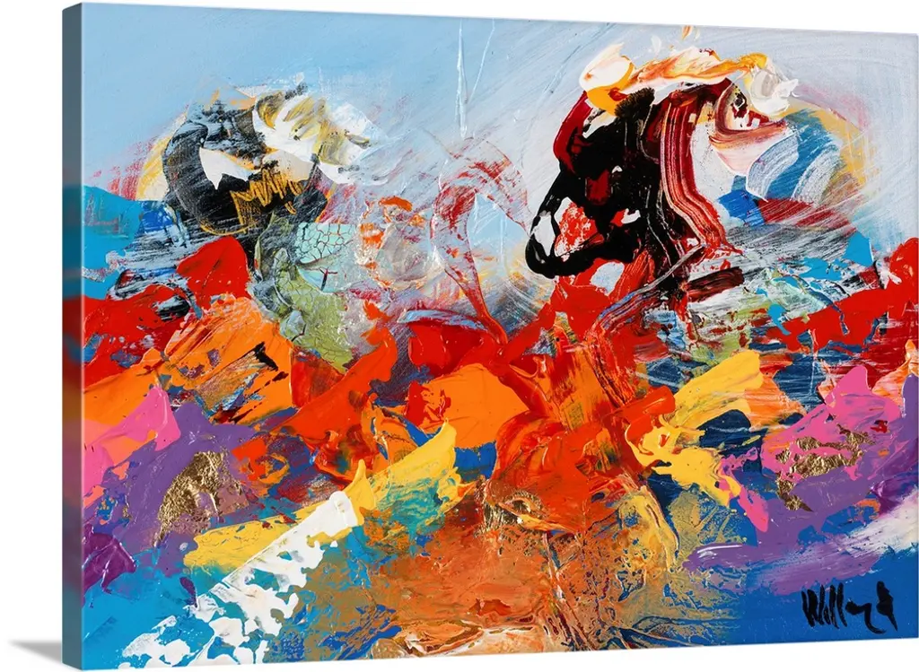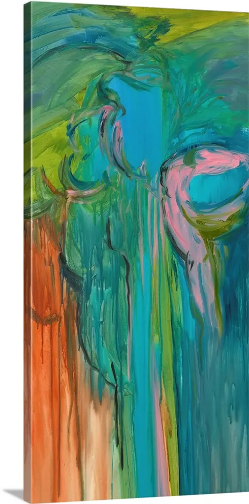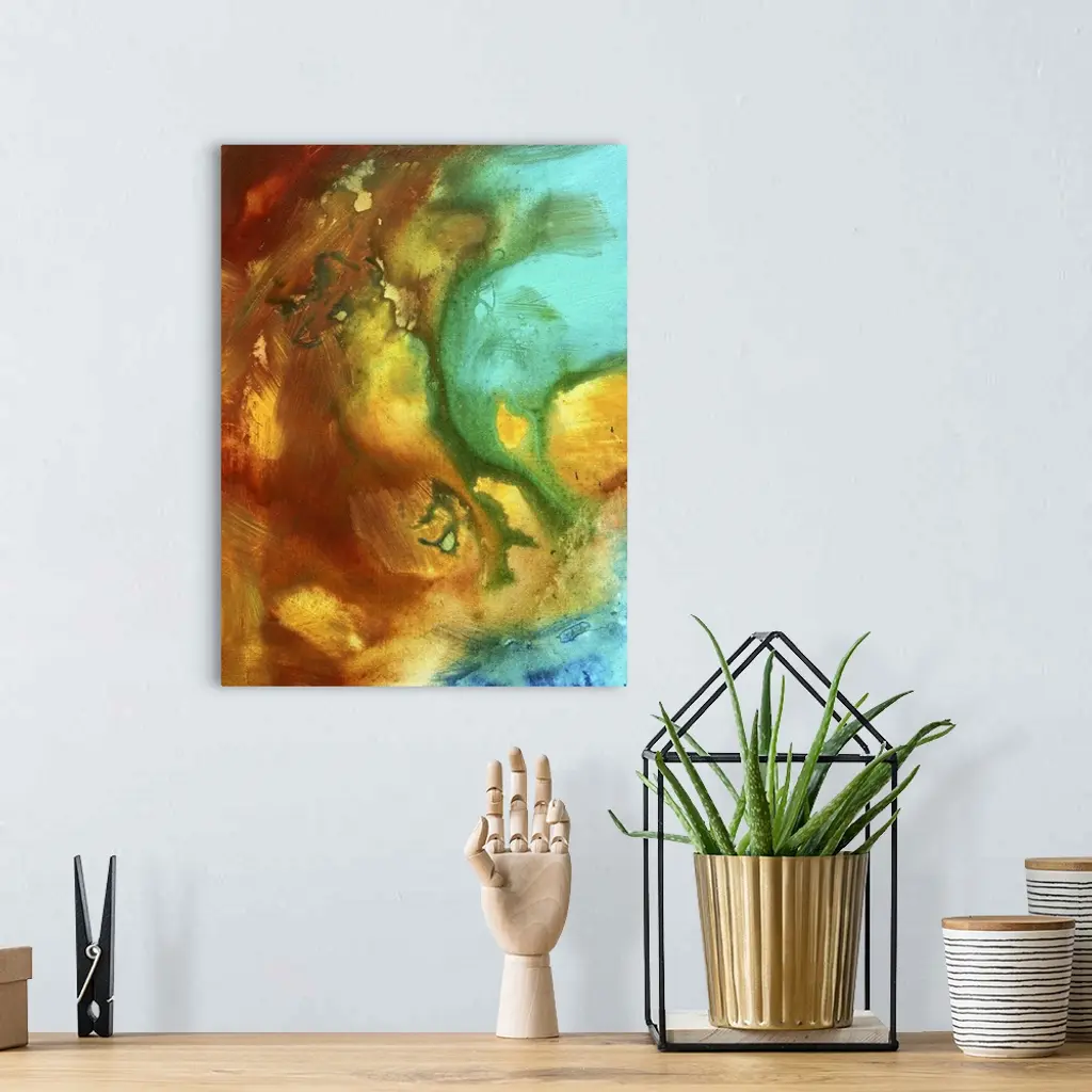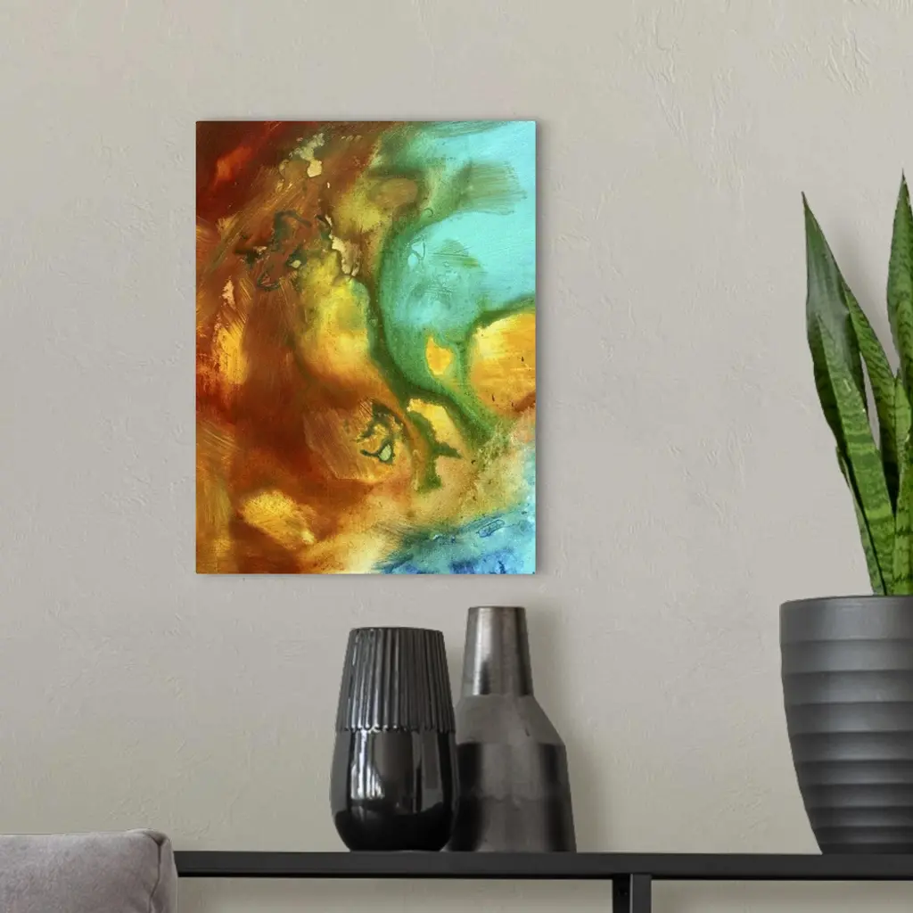 This is a huge colorful and bold original abstract painting unique and very distinct in contemporary style. The fluid colors of rust, yellows and turquoise create drama and boldness in this beautiful artwork.