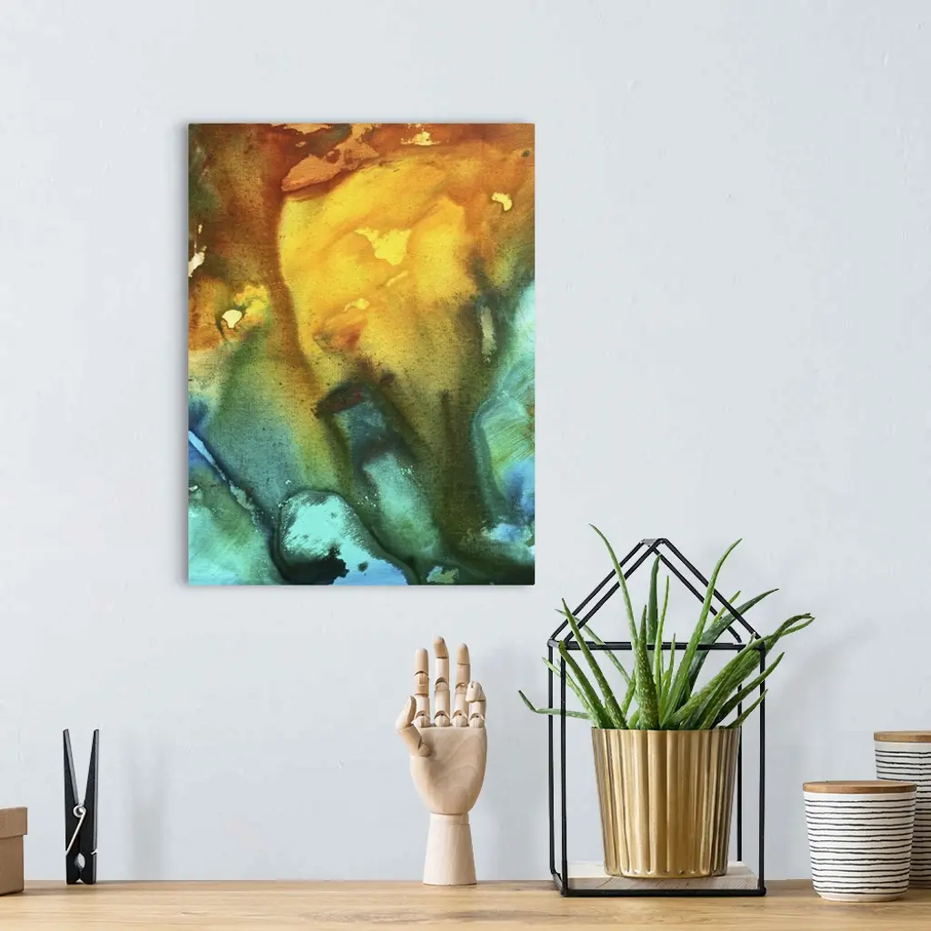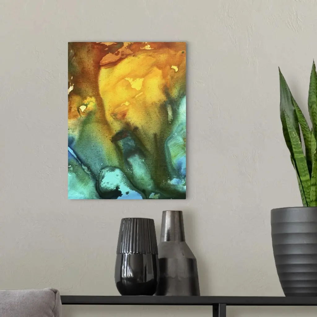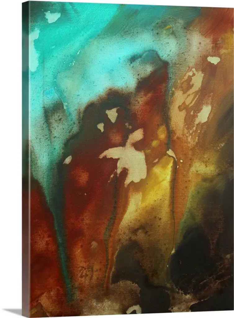 This is a vertical Giclee print of a contemporary piece of art work created by warm and cool paint colors blending and bleeding with each other on the canvas.