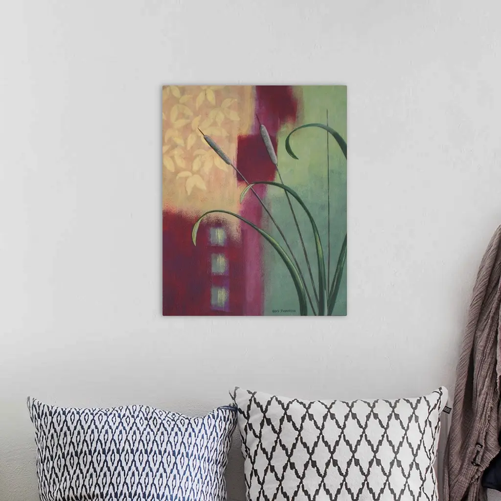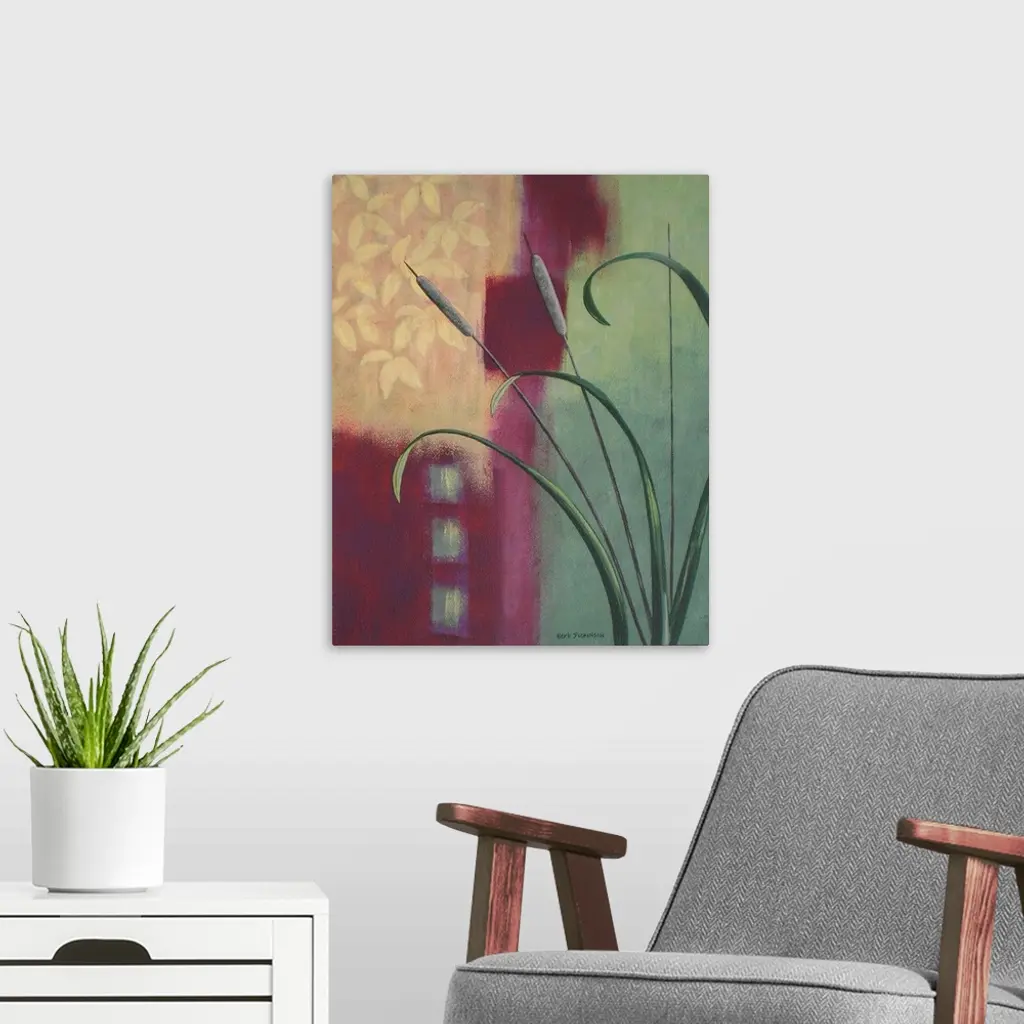 Contemporary painting of a plant with cattails on a decorative green, maroon and yellow background with designs.