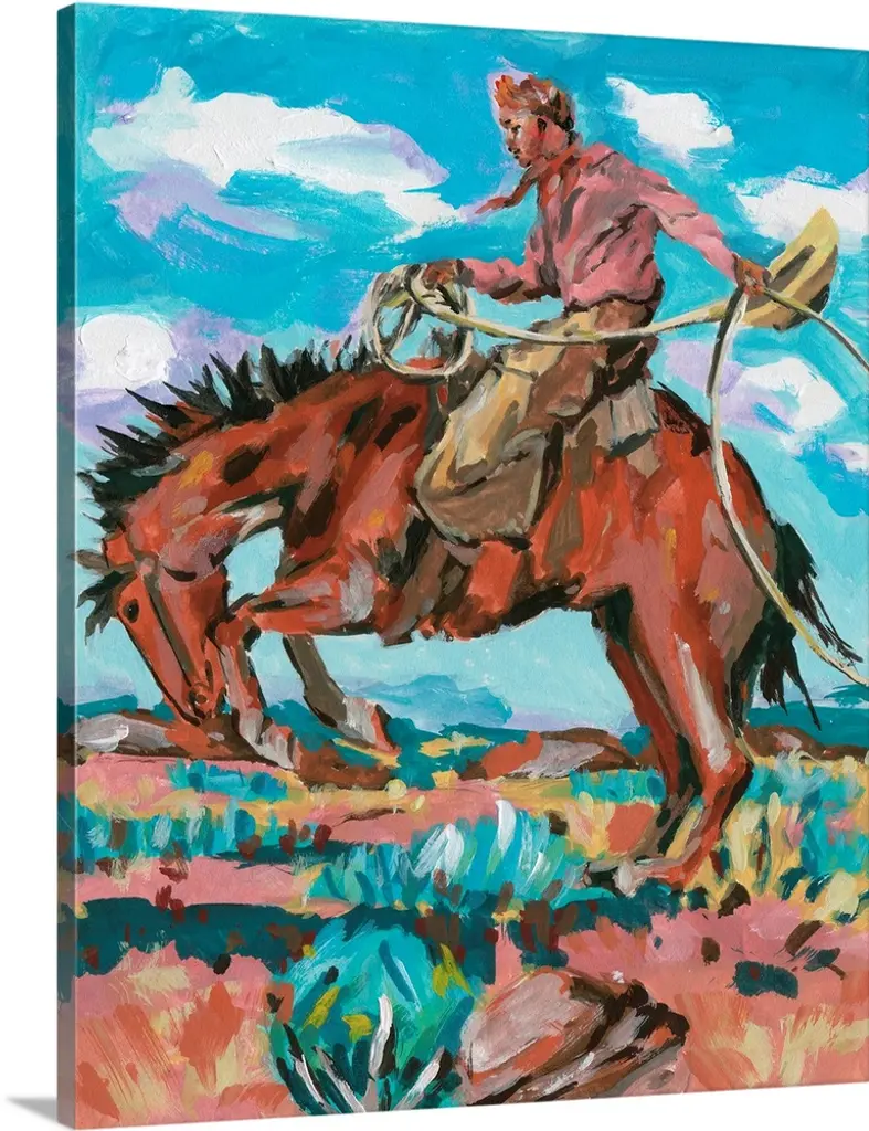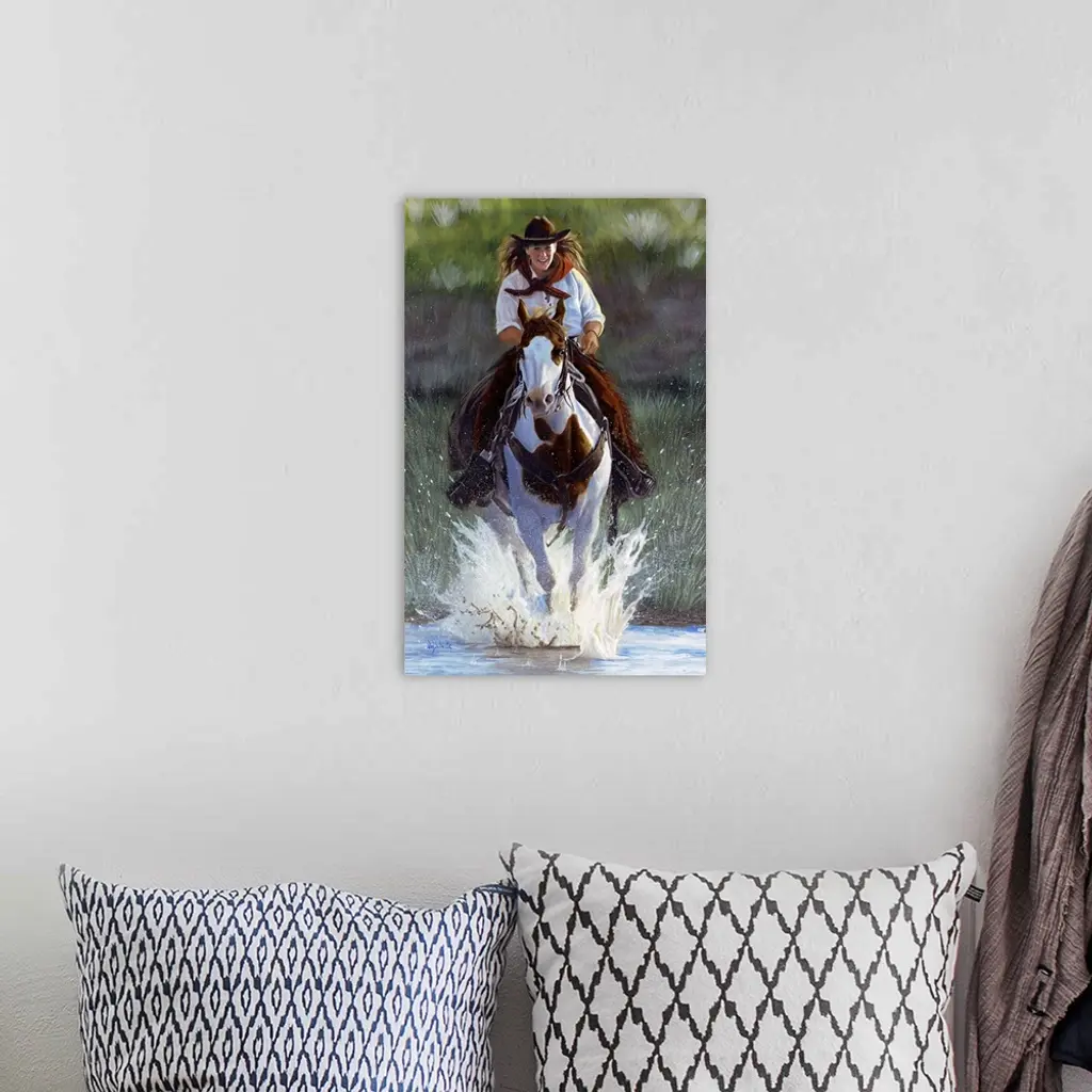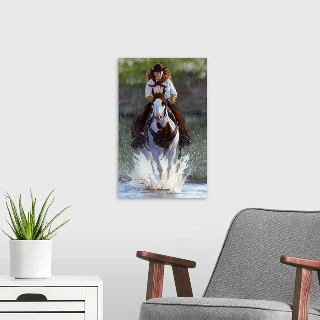 Painting of a cowgirl riding a paint horse through a shallow river.