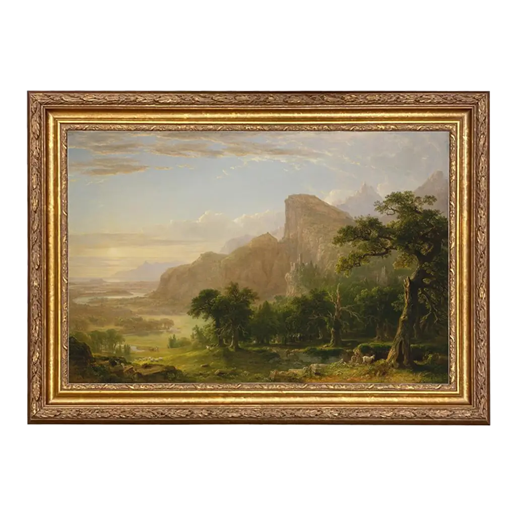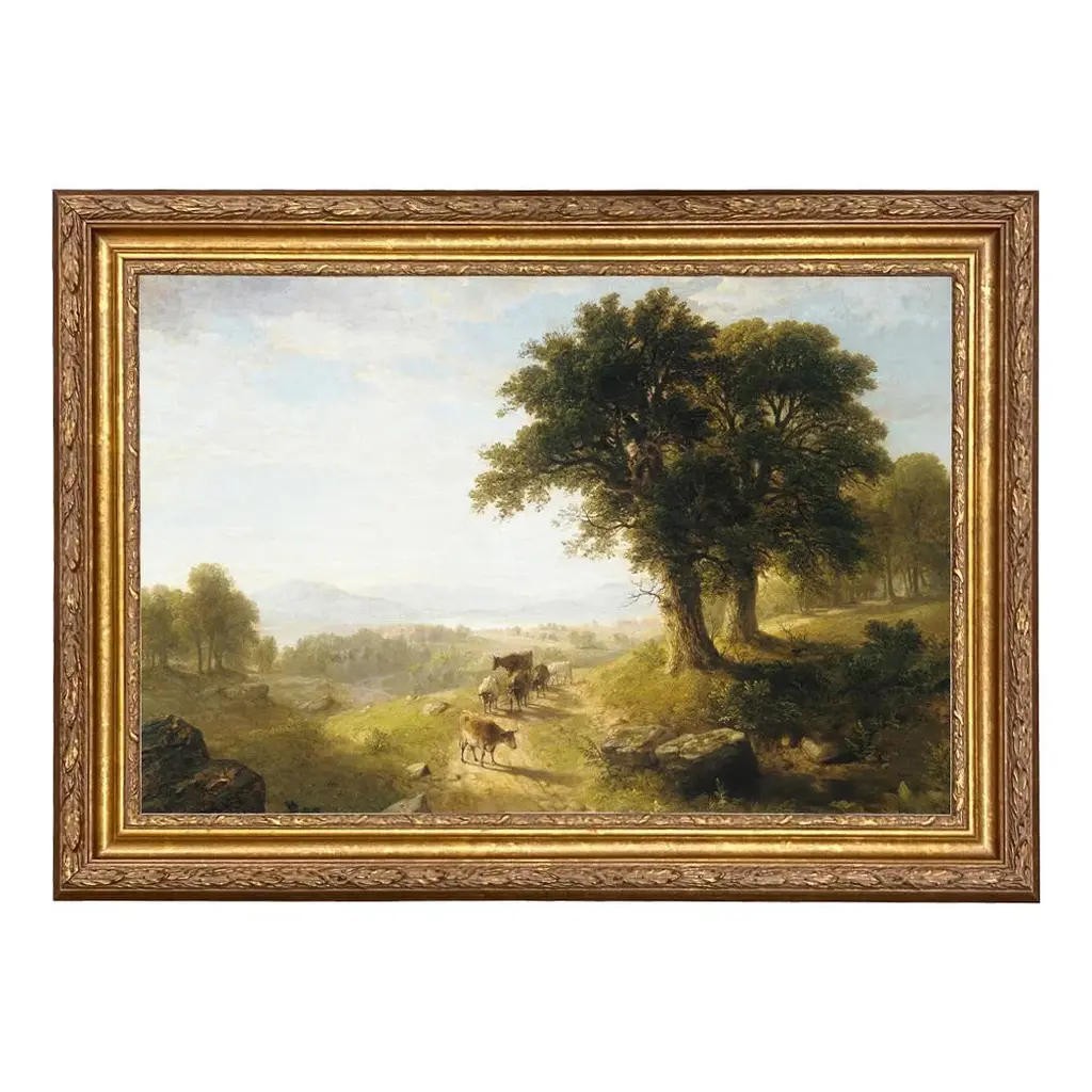 Accurate reproduction of the original oil painting by American painter Asher Brown Durand (1796-1886), this image is printed on canvas, mounted to a board and treated with a historic looking varnish. Framed in an ornate antiqued gold wood and gesso frame, the back is finished with craft paper and a wire hanger. Made in the USA. Frame width: 3-1/4" Frame thickness: 2"