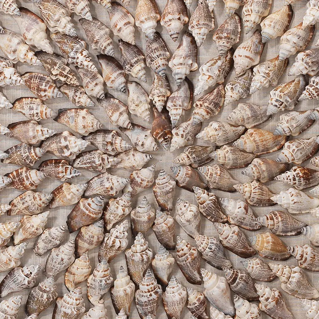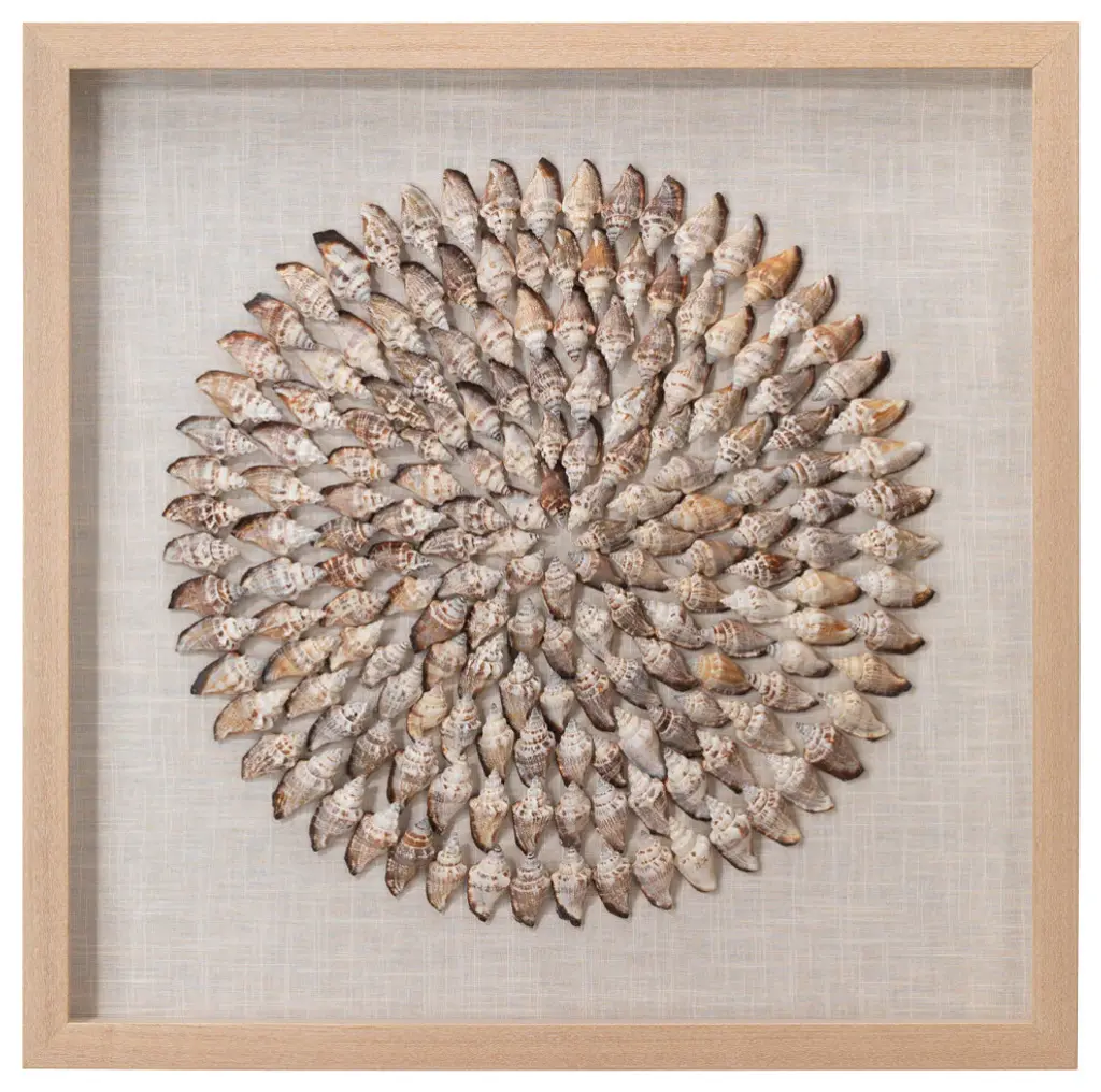 An assortment of natural simnia shells are arranged into shrinking concentric circles that highlight its mesmerizing organic beauty with a range of natural seaside colors and textures. Arranged by hand with natural materials and framed in wood, making each piece one of a kind. Position in your entryway, powder room or bedroom for an earthy, eye-catching accent. •Handcrafted from shells set in 100% linen backdrop•Pine wood frame and glass cover•Hangs vertical only•Natural multi-tone shellsThe inherent variations in tone and texture of shells is preserved, to create pieces rich in detail and natural beauty. These unique imperfections give our products character and individuality, with each piece having its own personality. •D-Loop Hanging Mechanism•Wood Frame: 1.06"" W•MDF Black Velvet BackingCare Instructions: Wipe clean using a soft, dry cloth or static duster. Avoid using harsh or abrasive cleaners as they can damage product.