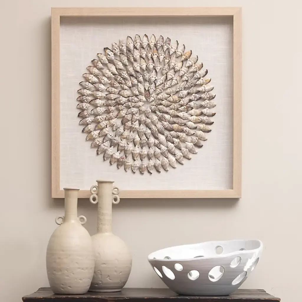 Introducing the Riviera Framed Wall Art by Jamie Young & Co. This artwork a stunning coastal-inspired masterpiece that brings the beauty of the shore to your living space. This exquisite piece captures the essence of the Riviera's tranquil shores through a captivating blend of colors and textures. Meticulously crafted with care, Riviera features intricate conch shells, linen, and MDF that evoke a sense of serenity and relaxation. Encased in a premium frame, the Riviera Wall Art exudes sophistication and complements your artisanal modern decor style effortlessly. Transform your walls into a coastal oasis.