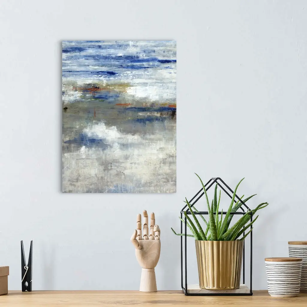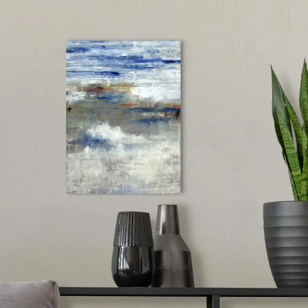 Contemporary abstract painting with cool blue, gray, and white tones with hints of warm gold and orange.