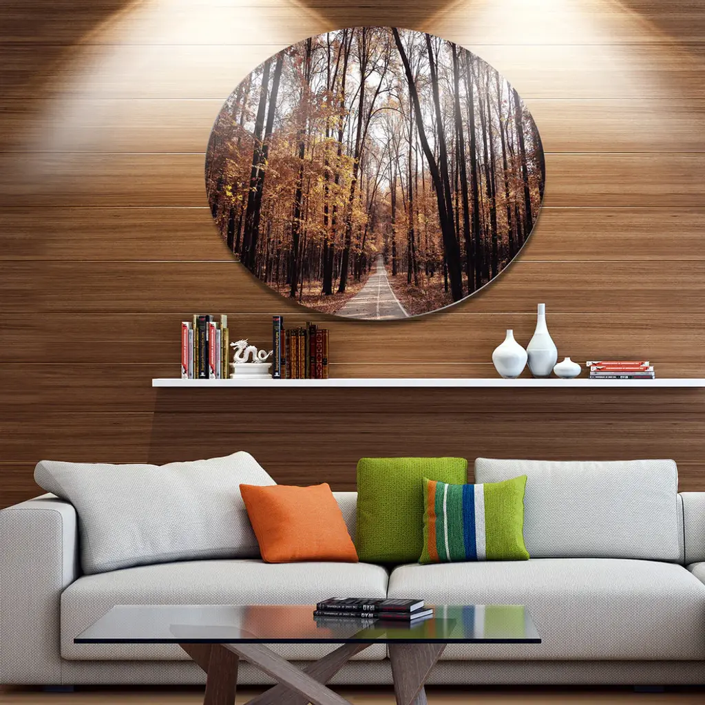 Bring Contemporary Abstraction to your home with this large Circle Metal wall art. This Road in Autumn Golden Forest Metal Artwork makes it the focal point of any room or office. - White Gloss Coating ensures colors are extra vibrant with light reflection.- Aluminum grade Sheet Metal with 1 inch mounting frame on the back giving the illusion that the artwork is floating on the wall..- Mounting Brackets are included along with instructions.- High Quality Digital images are created directly into a glossy aluminum panel producing a stunning and captivating print into the glossy finish of the metal.- Water, Fire and Scratch resistant HD Aluminum panels.- Looks better than any photo paper and guaranteed to last at least 20 years- Easy to clean with a microfiber cloth. Colors are far superior to regular Canvas Art. - Easy to Hang