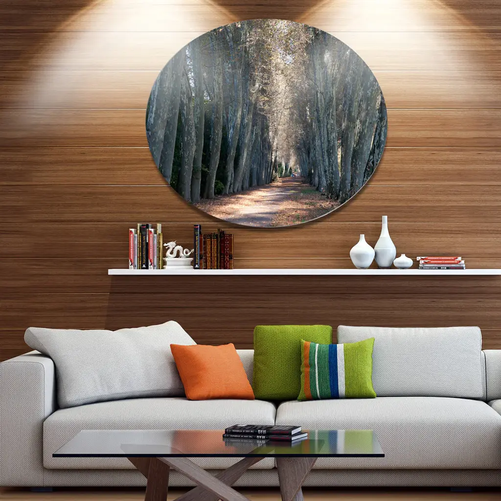 Bring Contemporary Abstraction to your home with this large Circle Metal wall art. This Road in Thick Autumn Woods Metal Artwork makes it the focal point of any room or office. - White Gloss Coating ensures colors are extra vibrant with light reflection.- Aluminum grade Sheet Metal with 1 inch mounting frame on the back giving the illusion that the artwork is floating on the wall..- Mounting Brackets are included along with instructions.- High Quality Digital images are created directly into a glossy aluminum panel producing a stunning and captivating print into the glossy finish of the metal.- Water, Fire and Scratch resistant HD Aluminum panels.- Looks better than any photo paper and guaranteed to last at least 20 years- Easy to clean with a microfiber cloth. Colors are far superior to regular Canvas Art. - Easy to Hang