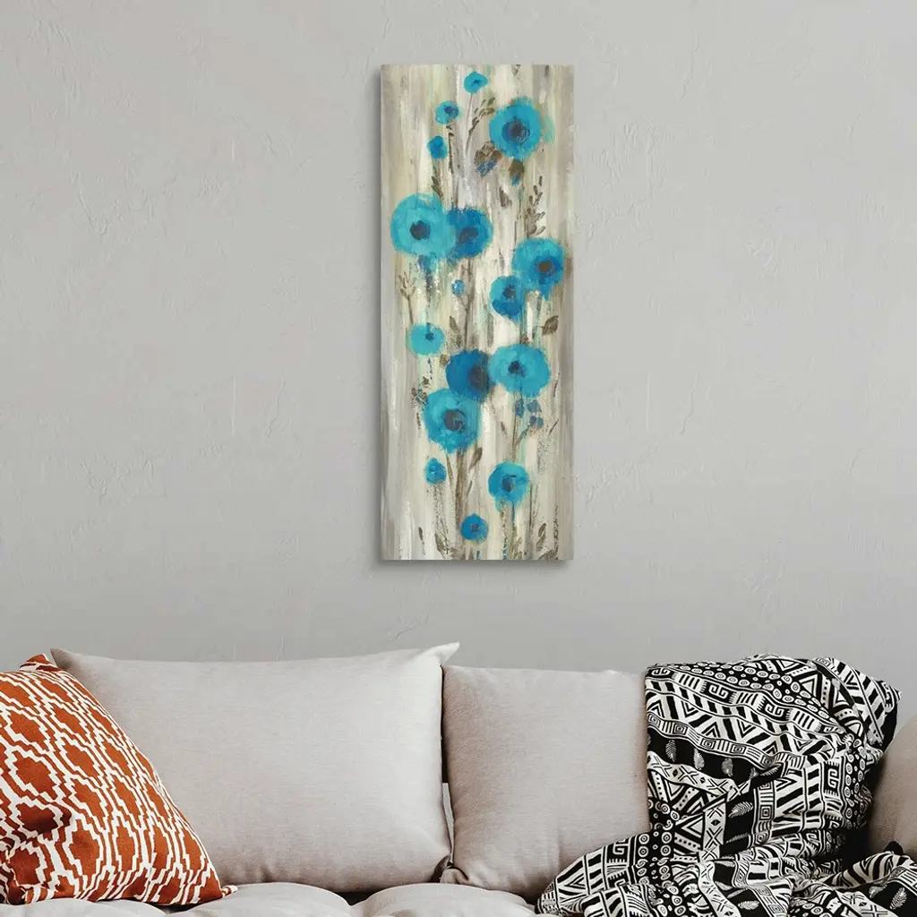 Contemporary artwork of abstract blue flowers over cascading gray color.