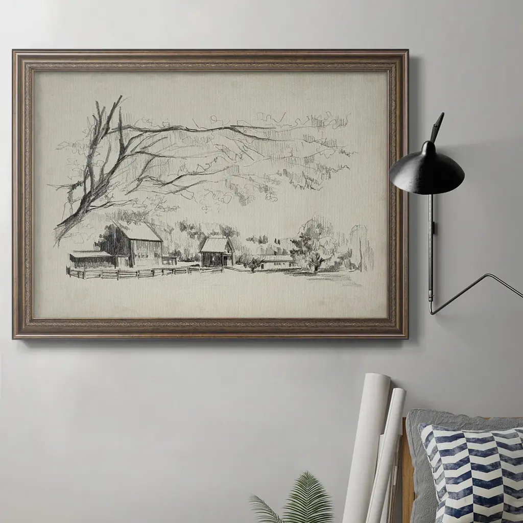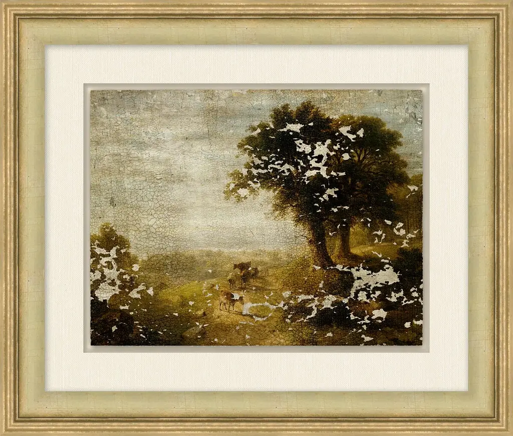 Designed by us and available only at One Kings Lane: An antique print of roaming cows is reproduced here on high-quality matte paper and displayed under glass with a double off-white mat. Beautifully framed, this piece arrives ready to hang.