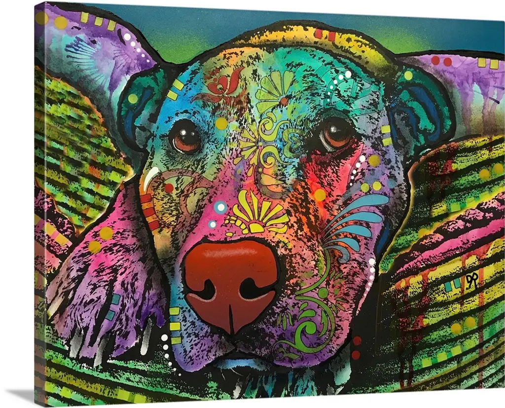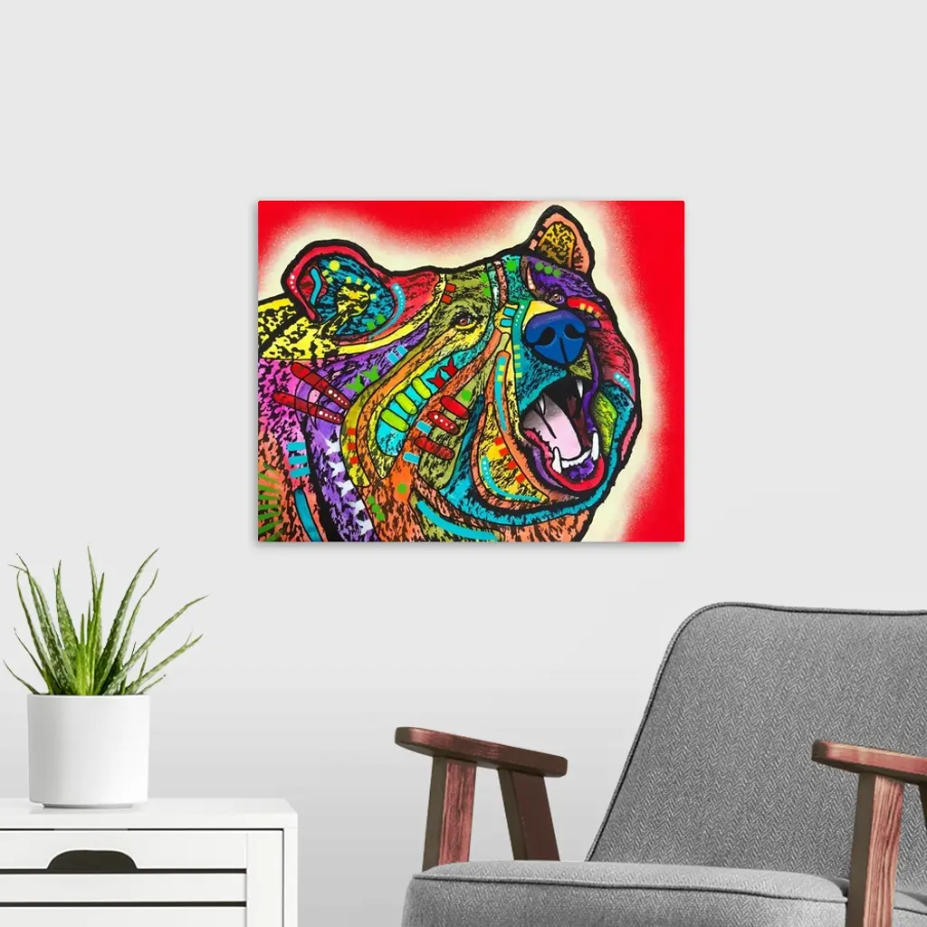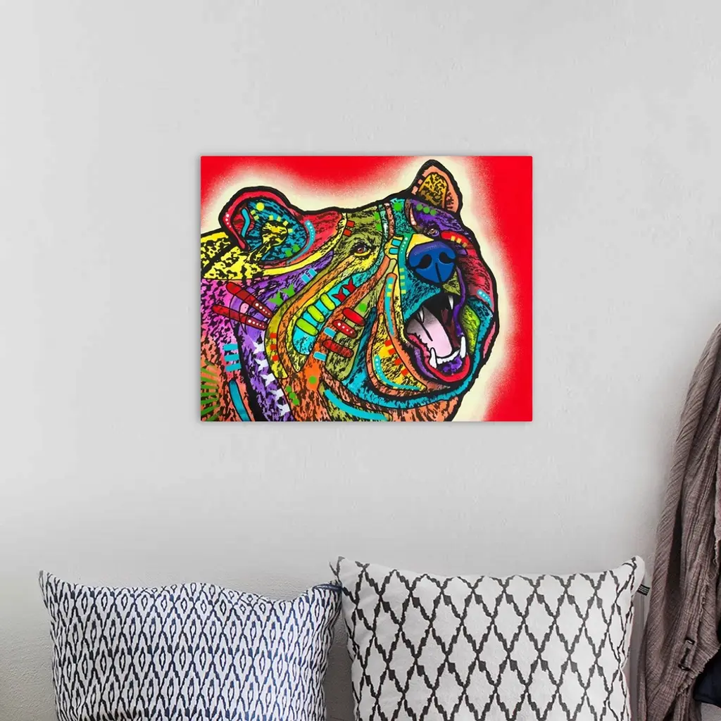 Contemporary stencil painting of a bear filled with various colors and patterns.