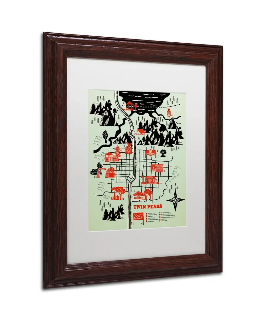 Artist: Robert FarkasSubject: AnimalsStyle: ContemporaryProduct Type: Wood Frame, White Mat, AcrylicMade in USAThis ready to hang, matted framed art piece features a labeled map of the fictional town of Twin Peaks.Robert Farkas started drawing at an early age and soon after took interest in graphic design. Self-taught in programs like Flash and Dreamweaver, Robert worked as a freelance designer, which eventually led to an Art Director position. After additional studies in programming, Farkas moved into the realm of television graphics, designing for several major Hungarian channels. He enjoys combining the visual aspects inspired by both his 2D and 3D experience. Today, Farkas continues his freelance work into t-shirt design.An 8x10 giclee print under acrylic in an 11x14 wood frame. Giclee (jee-clay) is an advanced printmaking process for creating museum quality fine art reproductions. This high quality print is matted using antique white matting and comes in a wood frame. A clear acrylic facing is added to protect the print. The piece is fully assembled by professional framers and comes ready to hang. The antique white mat allows the image to really stand out, making it a great addition to any space.