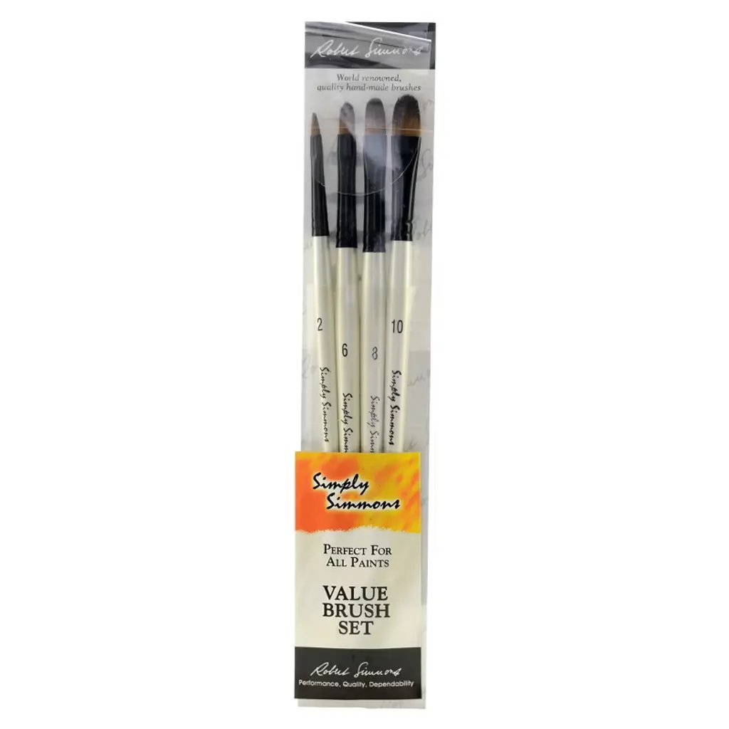 Discover exceptional value and performance with Robert Simmons Simply Simmons Long Handle Brush Sets. These economically priced brushes are crafted for durability, featuring stiff synthetic filaments that provide excellent point retention and spring, suitable for use with all types of paint, including oils, acrylics, and watercolors. The long handles offer comfortable control and reach, ideal for easel work. Perfect for students and experienced artists alike seeking reliable brushes without a high price tag. This 5-piece curated sets designed to provide essential shapes and sizes to start painting right away. The Robert Simmons Set of 5 includes one each of bright size 4, bright size 8, bright size 16, round size 4, and round size 16.