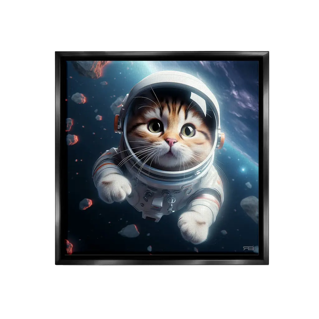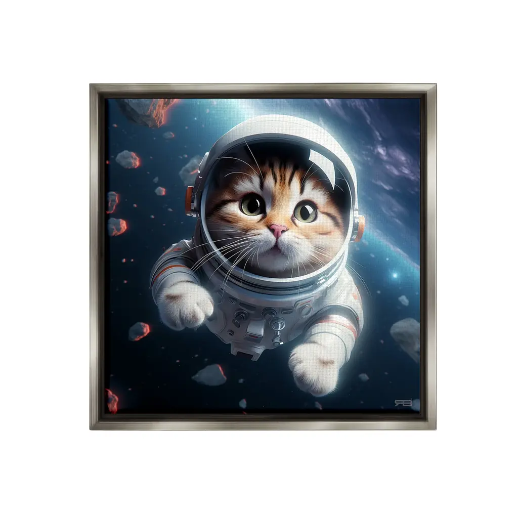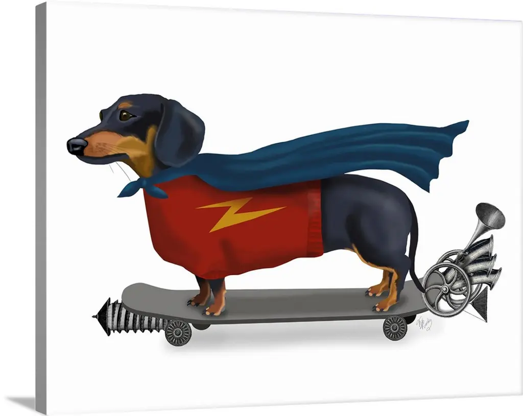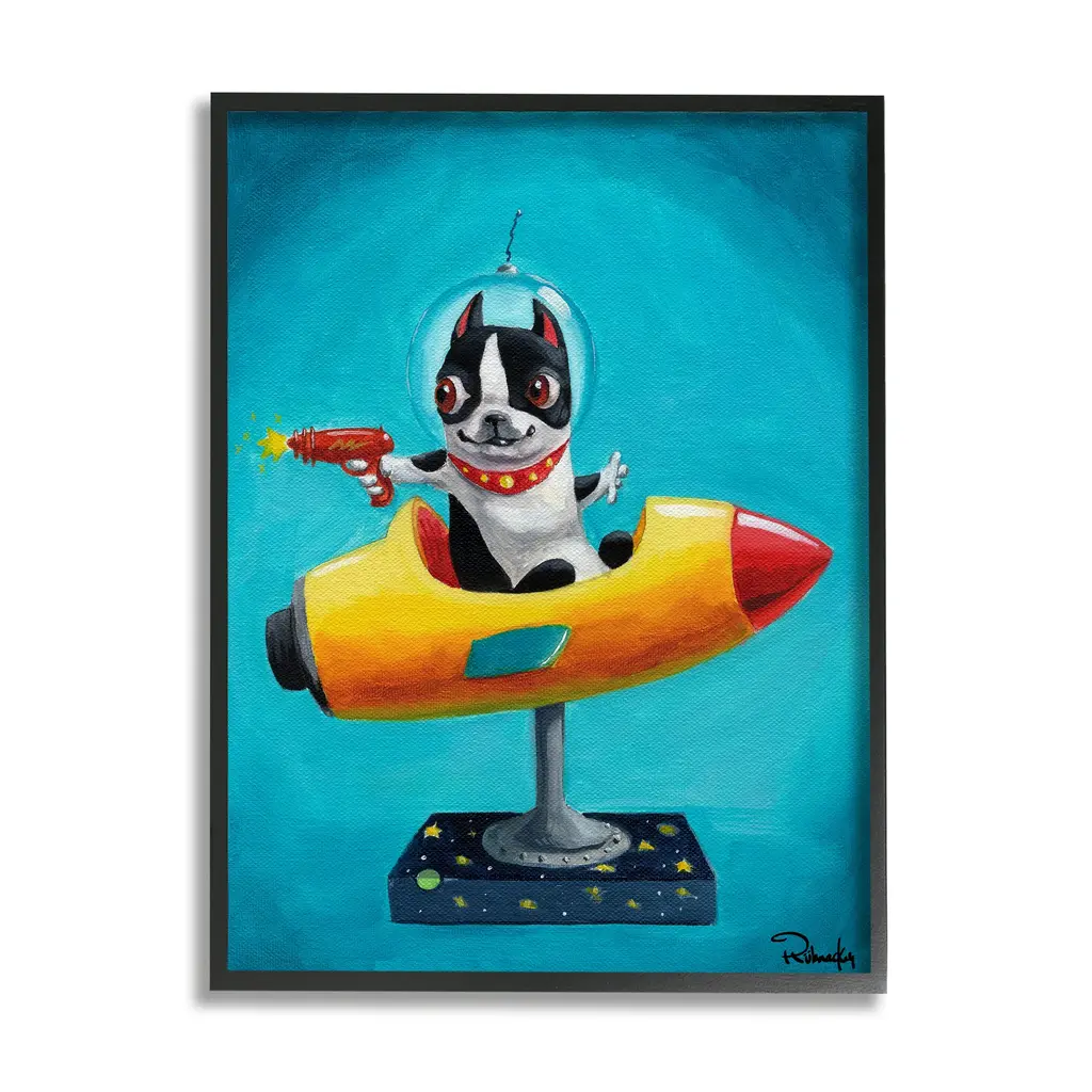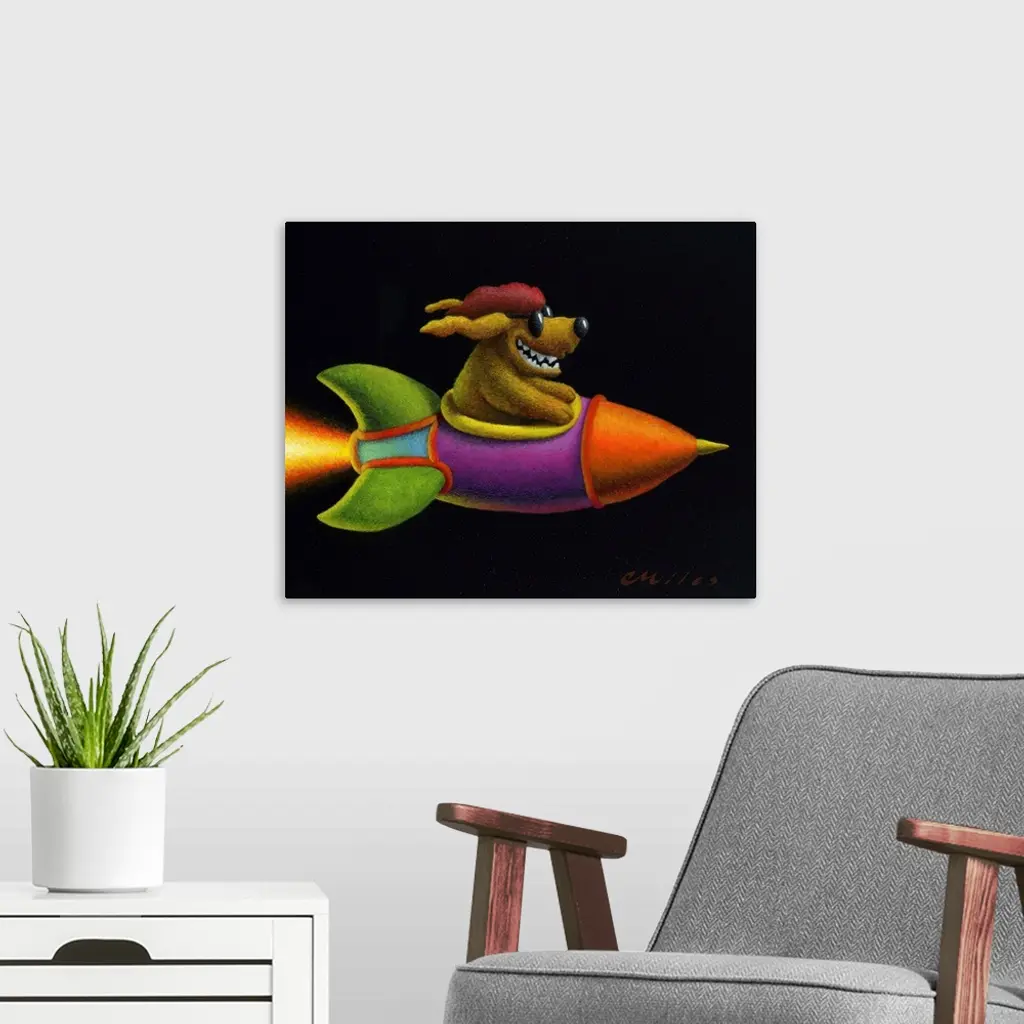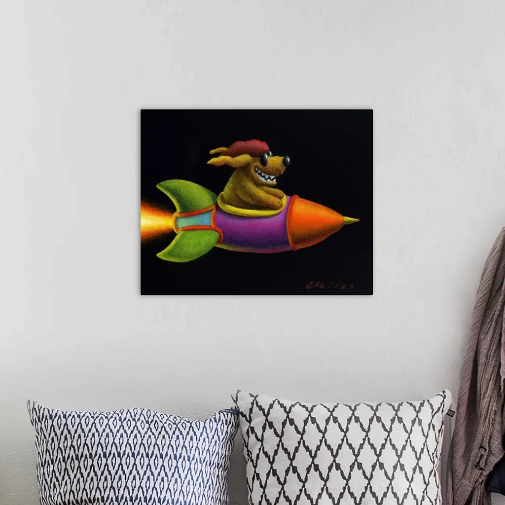 Humorous contemporary painting of a dog in sunglasses riding in a rocket.