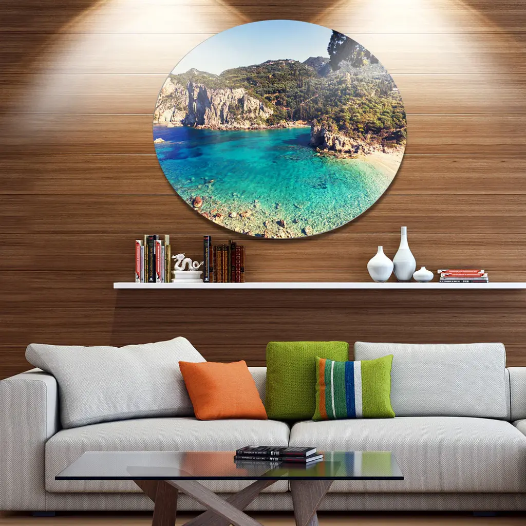 Bring Contemporary Abstraction to your home with this large Circle Metal wall art. This Rocky Beach with Turquoise Water Metal Artwork makes it the focal point of any room or office. - White Gloss Coating ensures colors are extra vibrant with light reflection.- Aluminum grade Sheet Metal with 1 inch mounting frame on the back giving the illusion that the artwork is floating on the wall..- Mounting Brackets are included along with instructions.- High Quality Digital images are created directly into a glossy aluminum panel producing a stunning and captivating print into the glossy finish of the metal.- Water, Fire and Scratch resistant HD Aluminum panels.- Looks better than any photo paper and guaranteed to last at least 20 years- Easy to clean with a microfiber cloth. Colors are far superior to regular Canvas Art. - Easy to Hang