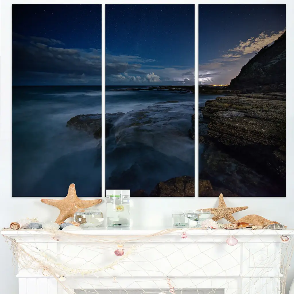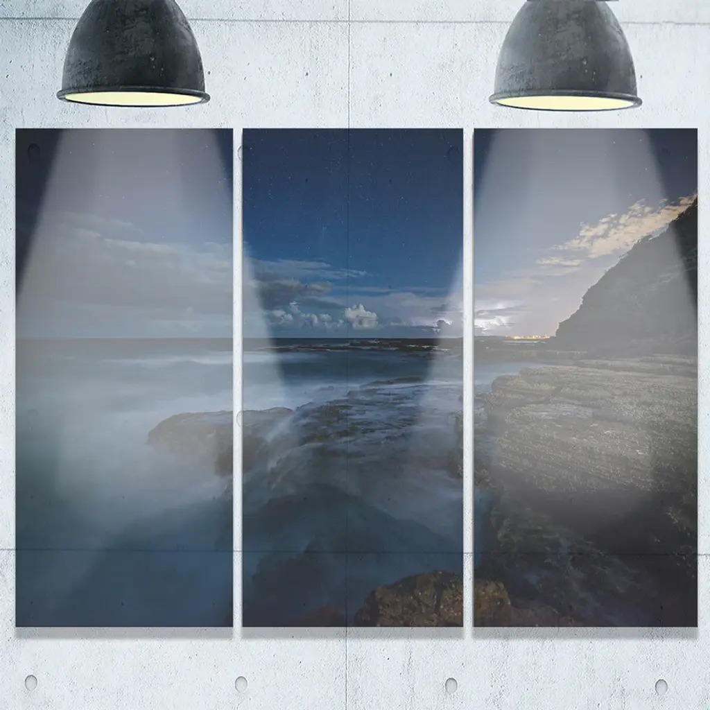 "Rocky Blue Ocean At Nighttime" Metal Wall Art, 3 Panels, 36"x28"