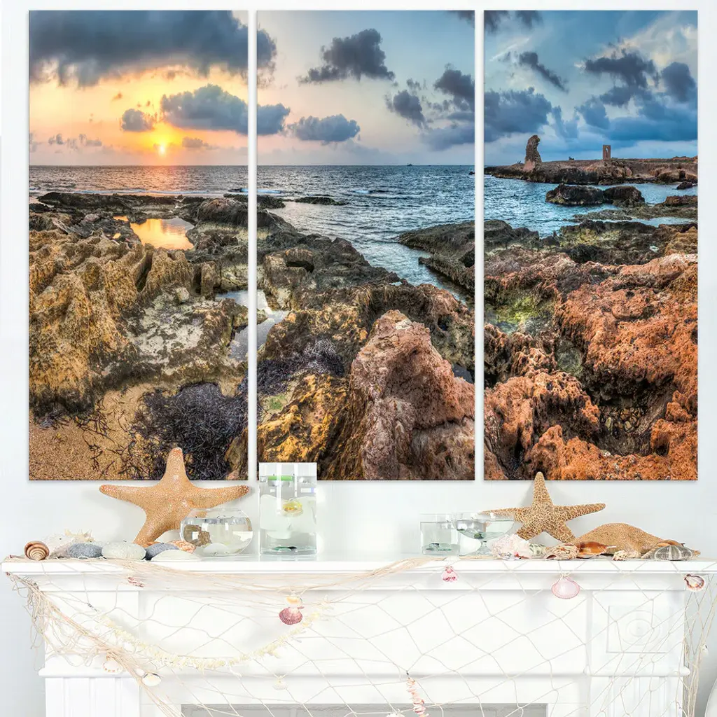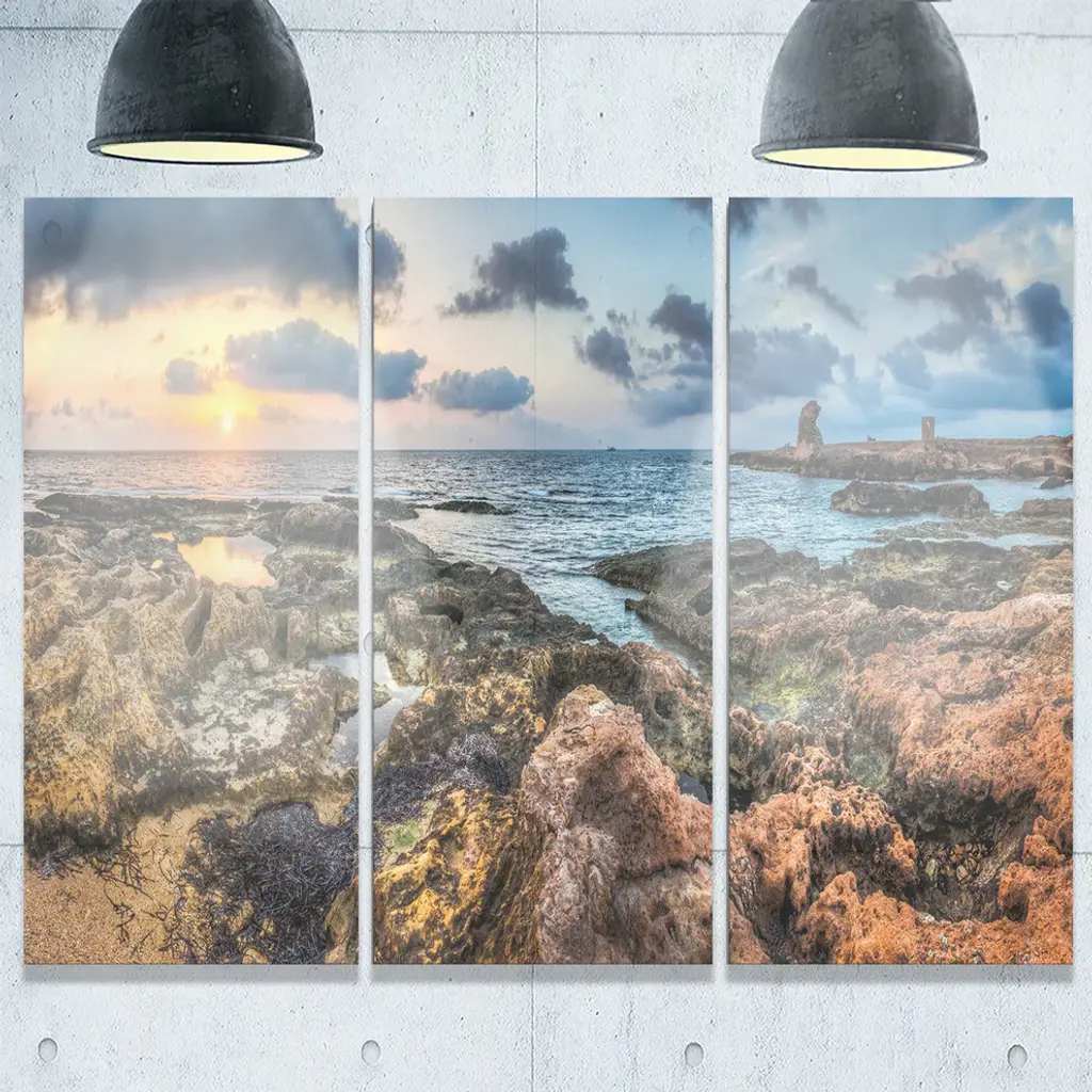 "Rocky Blue Seashore Sunset" Metal Wall Art, 3 Panels, 36"x28"