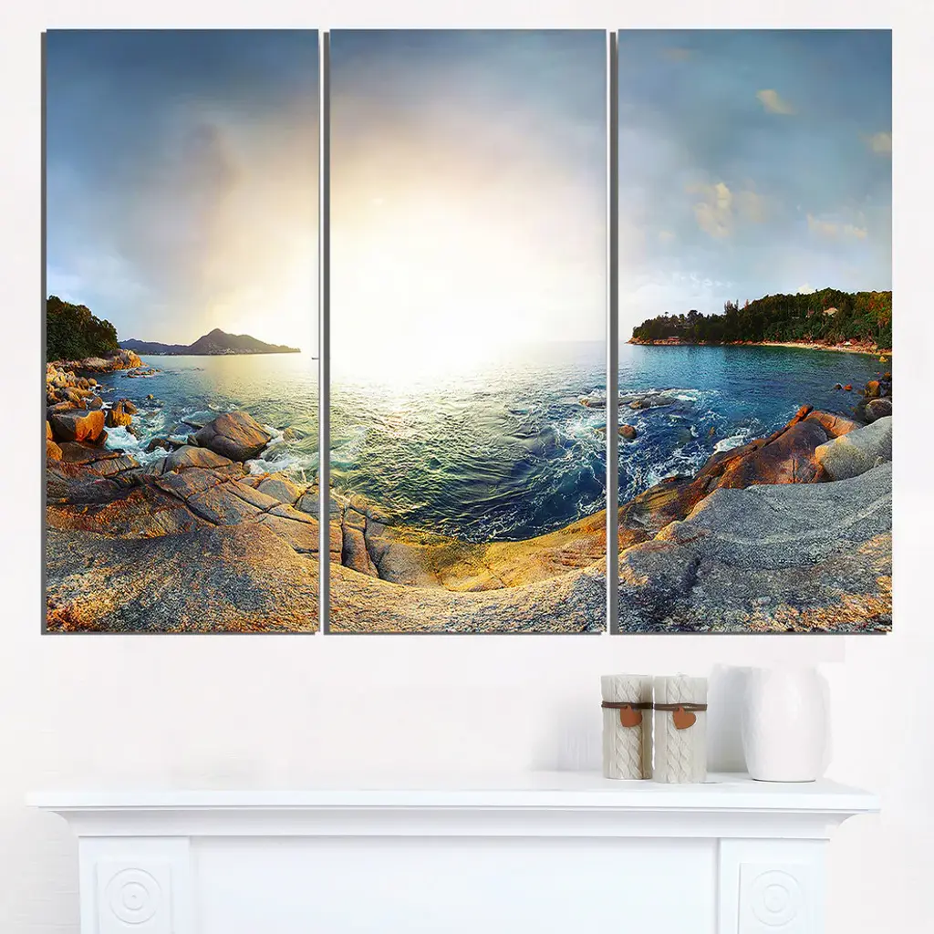 Bring contemporary abstraction to your home with this large 36W x 28H Metal Wall Art. This Rocky Coast in Andaman Sea Metal Artwork makes it the focal point of any room or office. - White gloss coating ensures colors are extra vibrant with light reflection.- Aluminum grade sheet metal with 1-inch mounting frame on the back giving the illusion that the artwork is floating on the wall.- Mounting brackets are included along with instructions.- High quality digital images are created directly into a glossy aluminum panel producing a stunning and captivating print into the glossy finish of the metal.- Water, fire and scratch resistant HD aluminum panels.- Looks better than any photo paper and guaranteed to last at least 20 years- Easy to clean with a microfiber cloth. Colors are far superior to regular canvas art. - Easy to hang