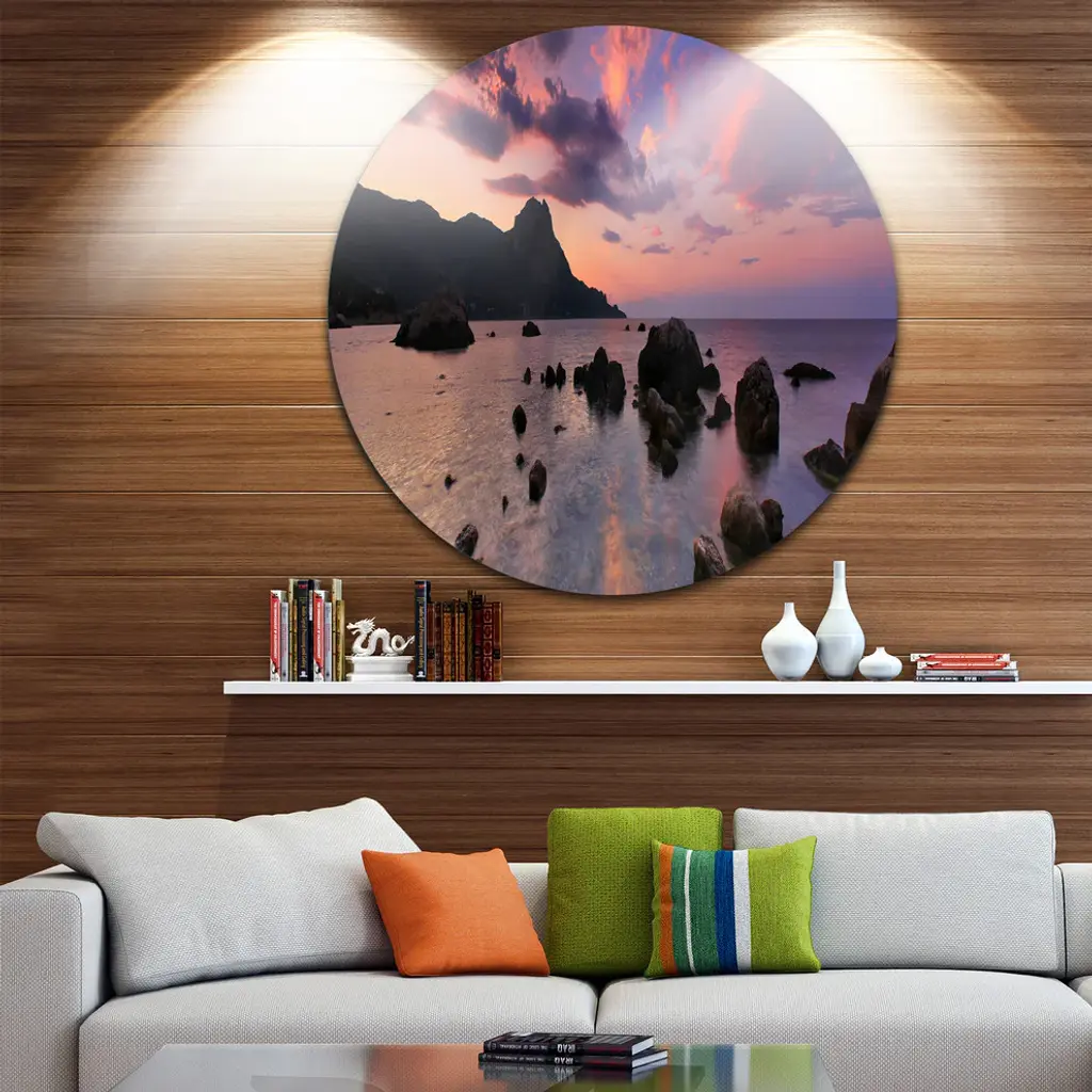 Bring Contemporary Abstraction to your home with this large Circle Metal wall art. This Rocky Colorful Beach Panorama Metal Artwork makes it the focal point of any room or office. - White Gloss Coating ensures colors are extra vibrant with light reflection.- Aluminum grade Sheet Metal with 1 inch mounting frame on the back giving the illusion that the artwork is floating on the wall..- Mounting Brackets are included along with instructions.- High Quality Digital images are created directly into a glossy aluminum panel producing a stunning and captivating print into the glossy finish of the metal.- Water, Fire and Scratch resistant HD Aluminum panels.- Looks better than any photo paper and guaranteed to last at least 20 years- Easy to clean with a microfiber cloth. Colors are far superior to regular Canvas Art. - Easy to Hang