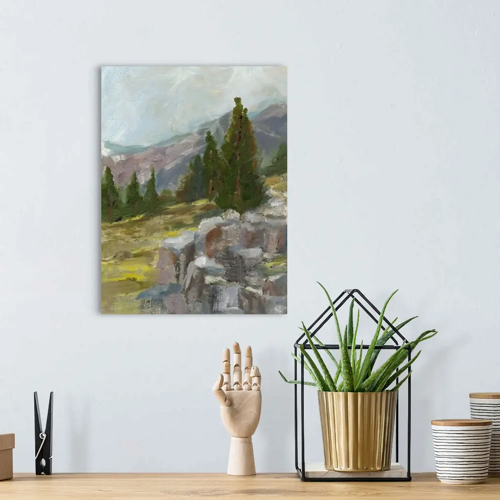 Contemporary painting of a rocky mountainous scene.