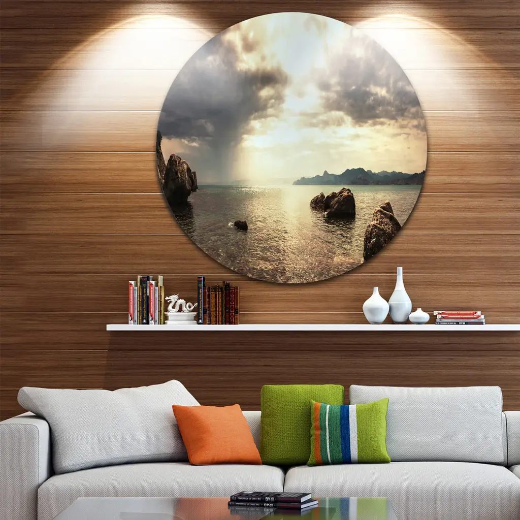 Rocky Seashore Under Clouds Panorama, Beach Disc Metal Wall Art, 23"
