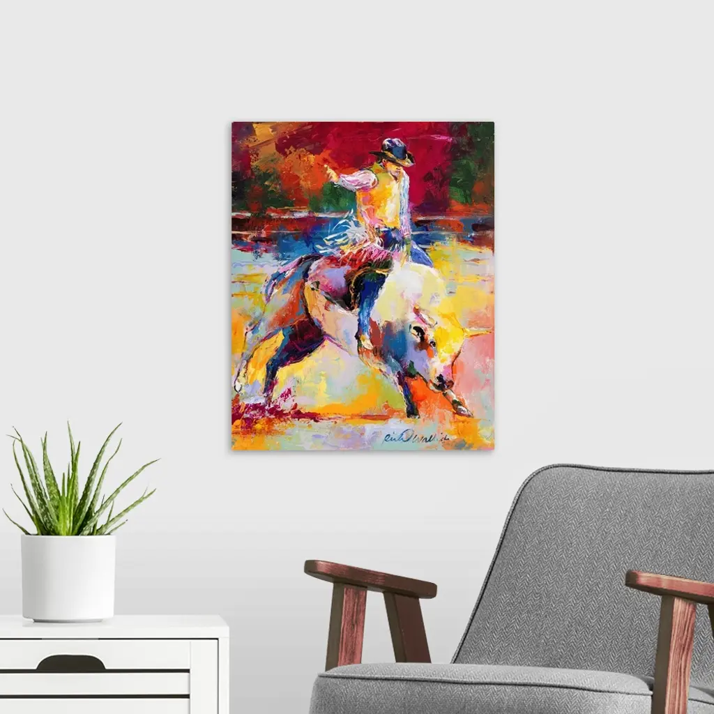 Colorful abstract painting of a man riding a bull at a rodeo.
