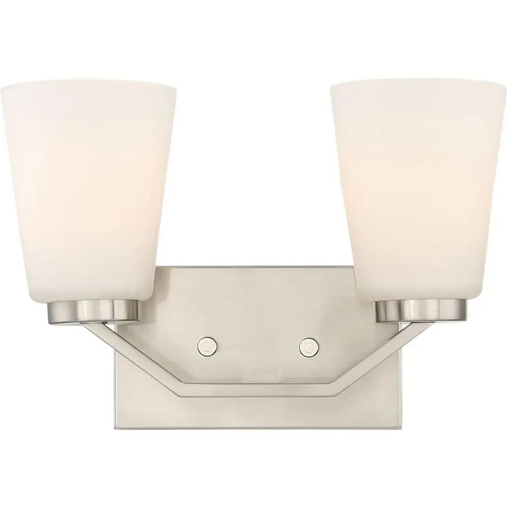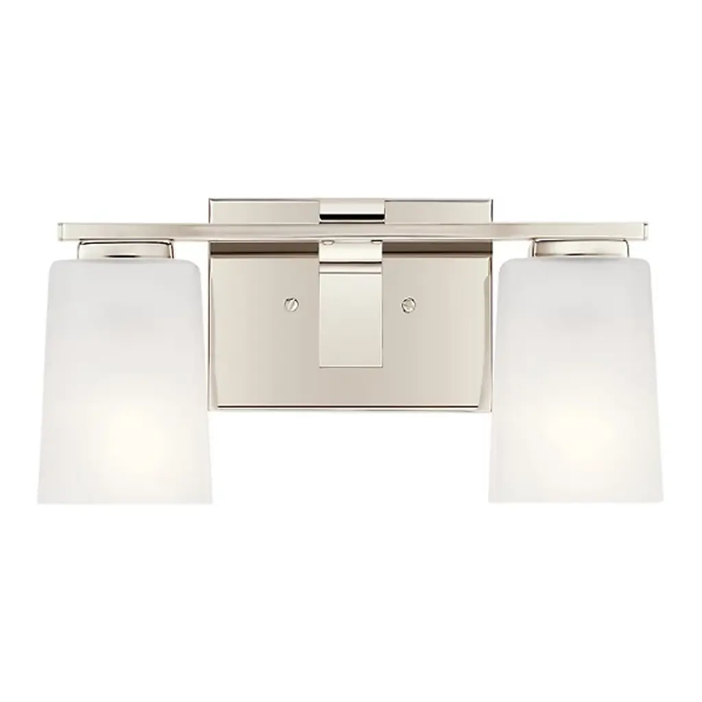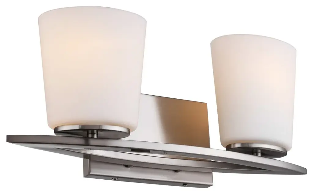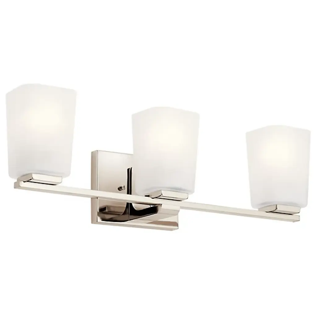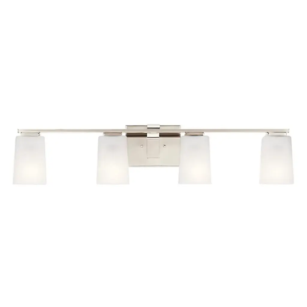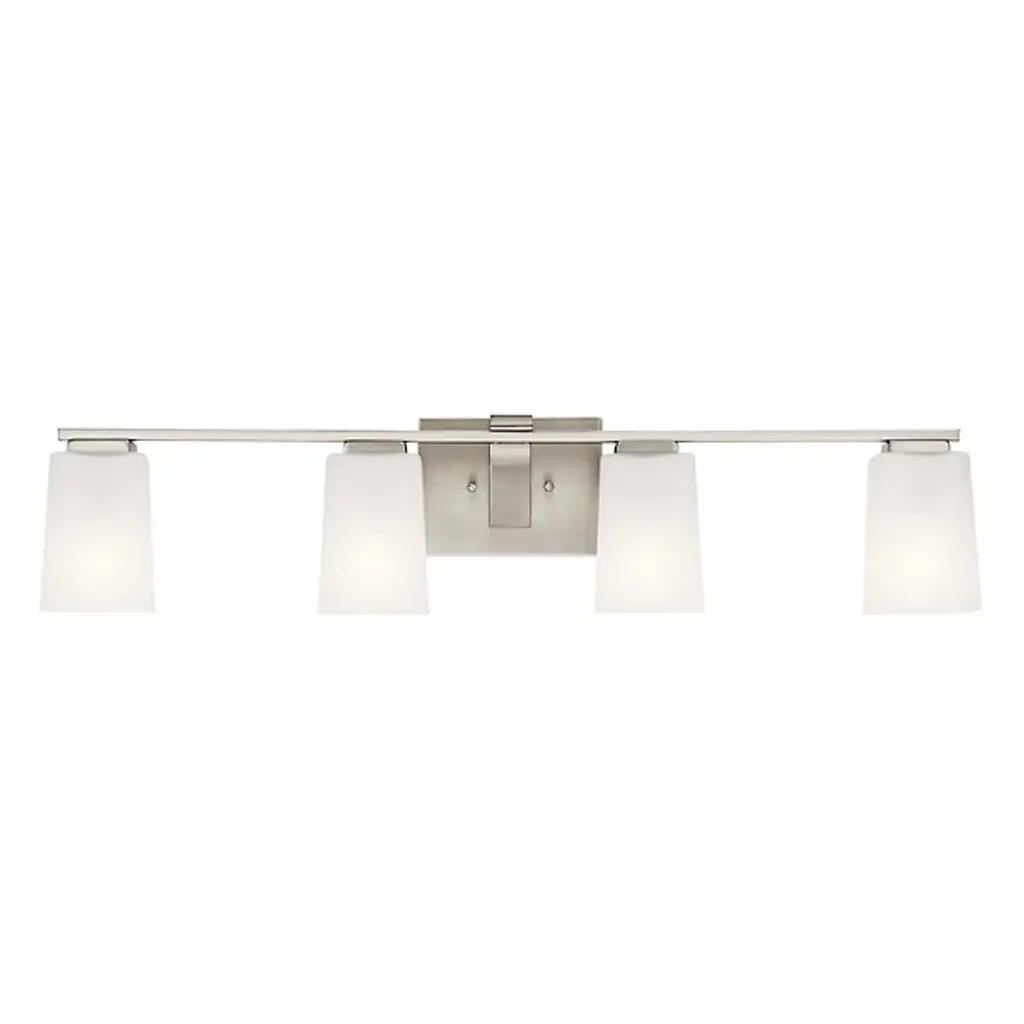 Balanced beauty. The Roehm Vanity Light from Kichler sits over your bathroom mirror with the perfect ratio of steel, glass, and light. A solid steel construction and a versatile backplate let you mount the piece with its shade’s openings facing up or down. In either orientation, its satin etched glass shades communicate elegance and glare-free properties as they filter light into a brilliant room-filling aura. A steel crossbar and protruding hook bring out the softness of the shade with their striking reflective surfaces.