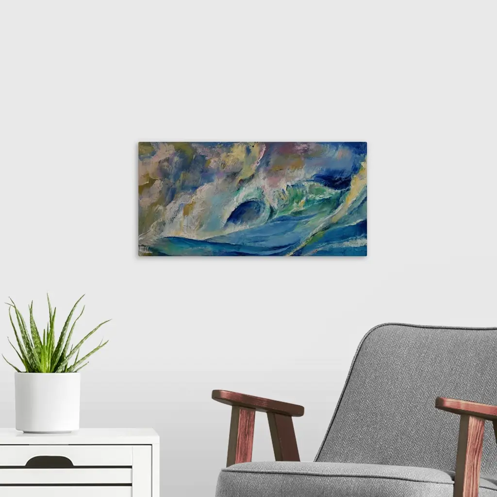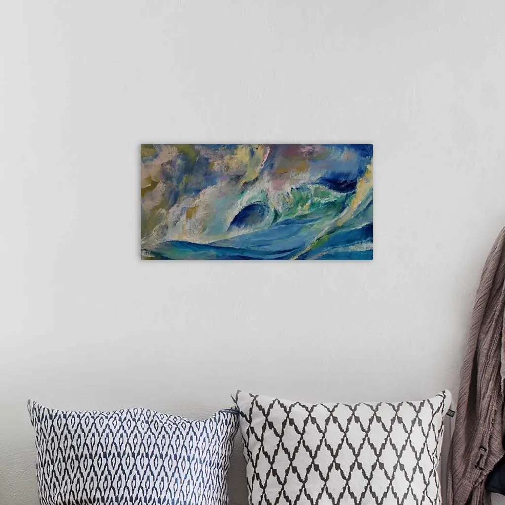 A contemporary painting of a green wave in the ocean curling over.