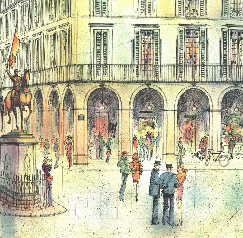 Artist: Rolf Rafflewski Title: Place Jeanne d'Arc, Paris Year: 1981 Signed: Yes Medium: Lithograph Paper Size: 22 x 30 inches ( 56 x 76 cm ) Image Size: 18.75 x 24.25 inches ( 48 x 62 cm ) Edition Size: 350 Framed: No Condition: A: Mint Additional Details: This limited edition lithograph, titled Place Jeanne d'Arc in Paris, was created by the artist Rolf Rafflewski. Printed on high-quality Arches Paper, the lithograph is part of a limited edition of 350 copies, each signed and numbered by the artist. The artwork vividly captures the bustling atmosphere of Place Jeanne d'Arc, a famous location in Paris. The composition centers around the iconic statue of Jeanne d'Arc (Joan of Arc) on horseback, depicted in a dynamic pose that conveys a sense of movement and determination. Surrounding the statue, groups of people are shown congregating, adding a lively and social element to the scene. Rafflewski’s skillful use of color and detail brings the historical and cultural significance of the location to life, making this lithograph a valuable addition to any art collection. The intricate details of the statue, the expressions of the people, and the architectural elements of the surrounding buildings are all rendered with precision and artistry, showcasing Rafflewski's talent.