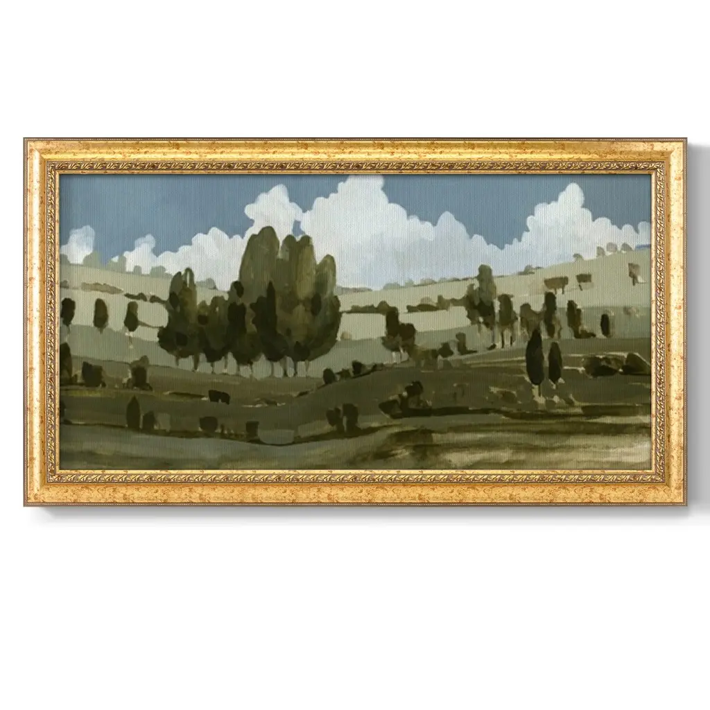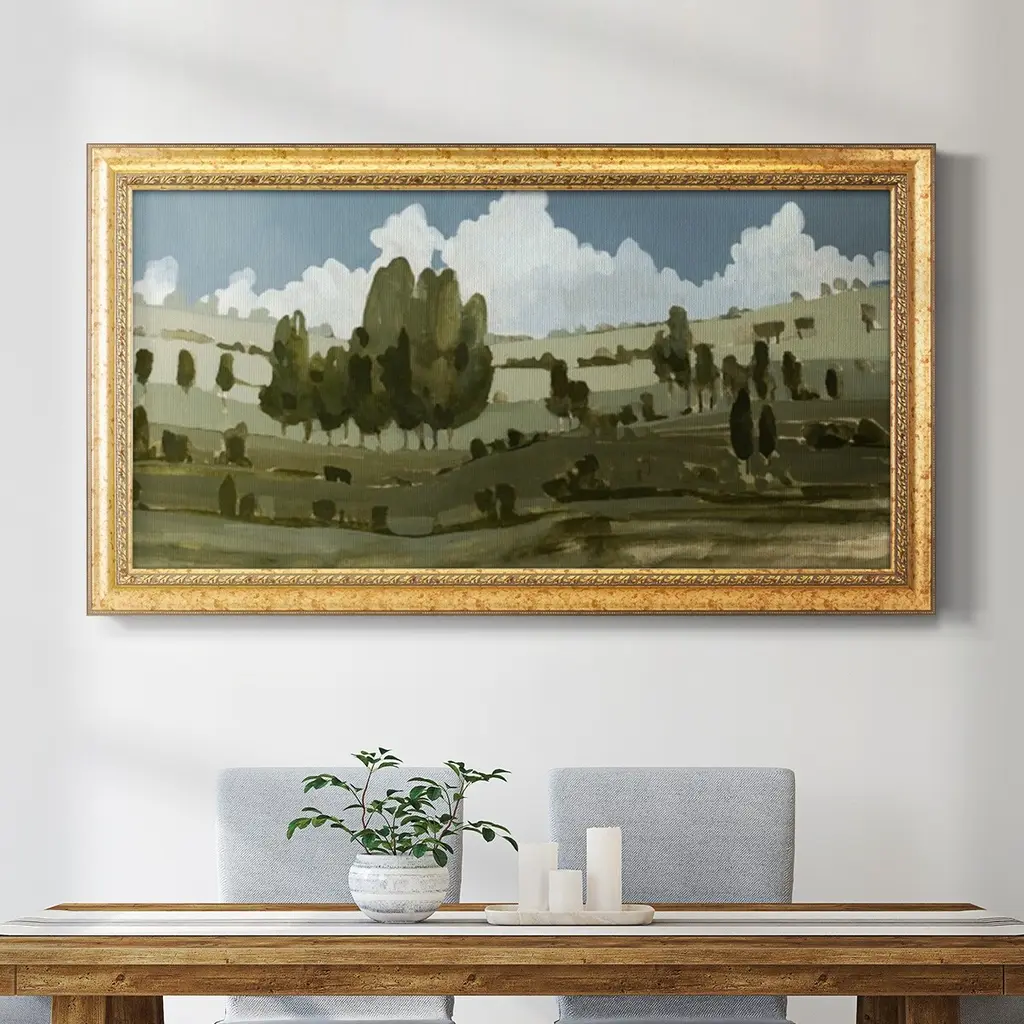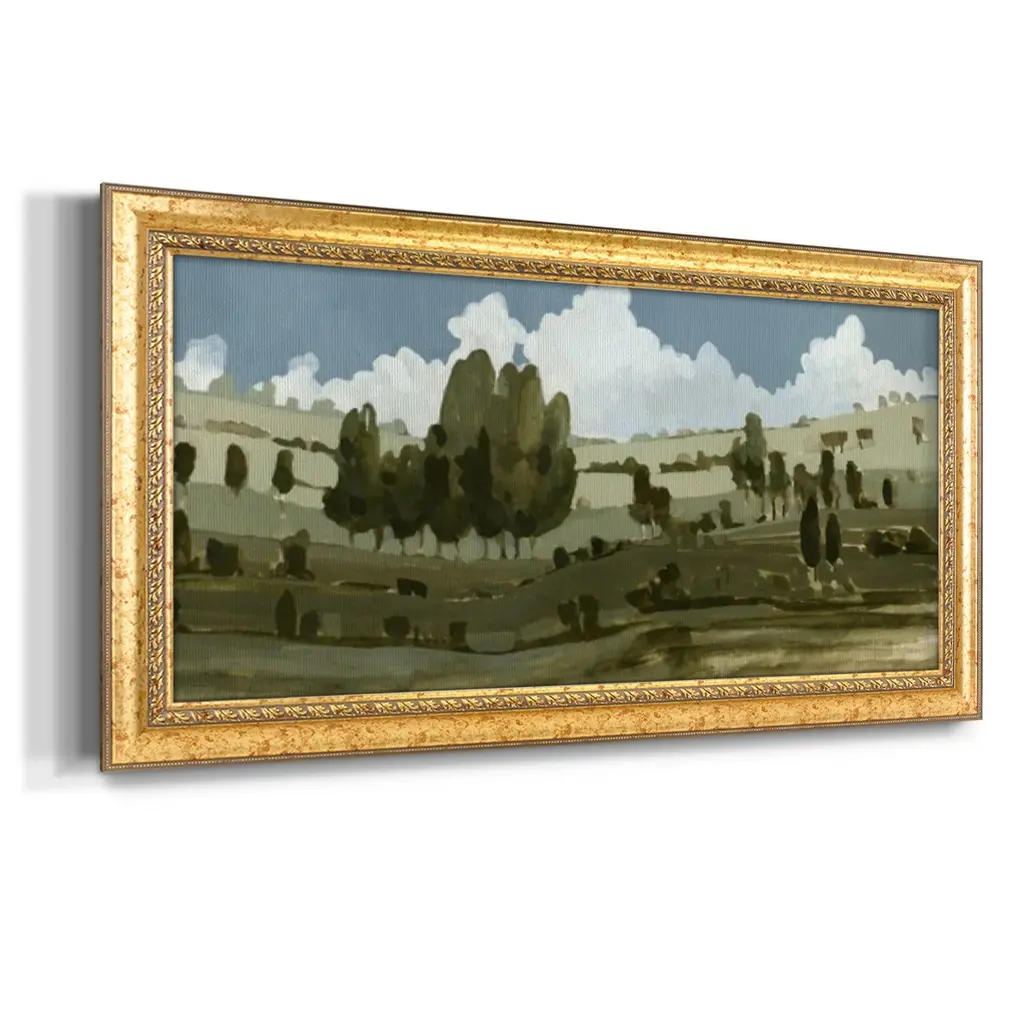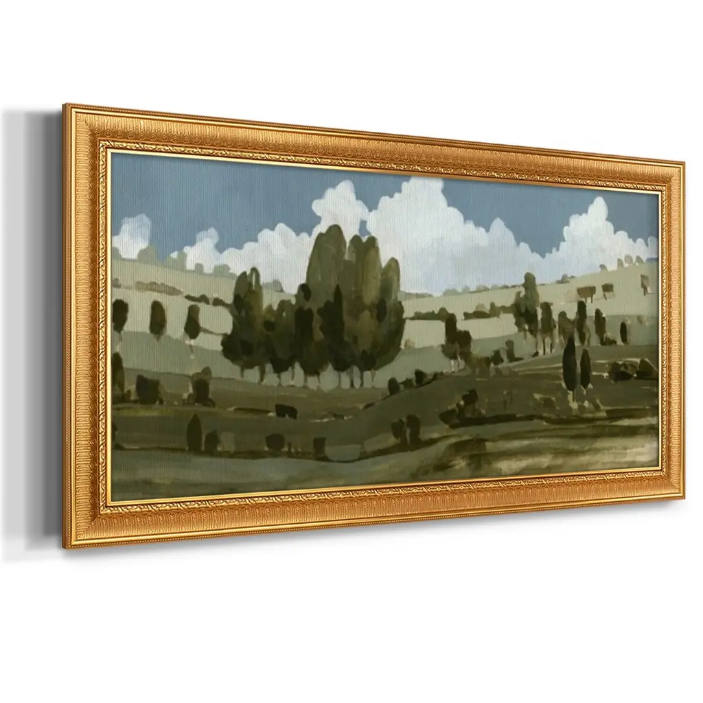Rolling Green III Premium Framed Canvas- Ready to Hang A Premium Framed Canvas created to last. Framed in distressed wood and available in an array of sizes and colors Featuring a beveled a solid wood stretcher bar, each piece comes ready to hand 3 SIZES AVAILABLE 21''X37'' - Overall Size 25''X45'' - Overall Size 29''x53'' - Overall Size Each piece is made to order. Each piece comes with hanging hardware. Made in the USA Ready to Hang Giclee Paper Print Acrylic Glass Beveled Matt Board
