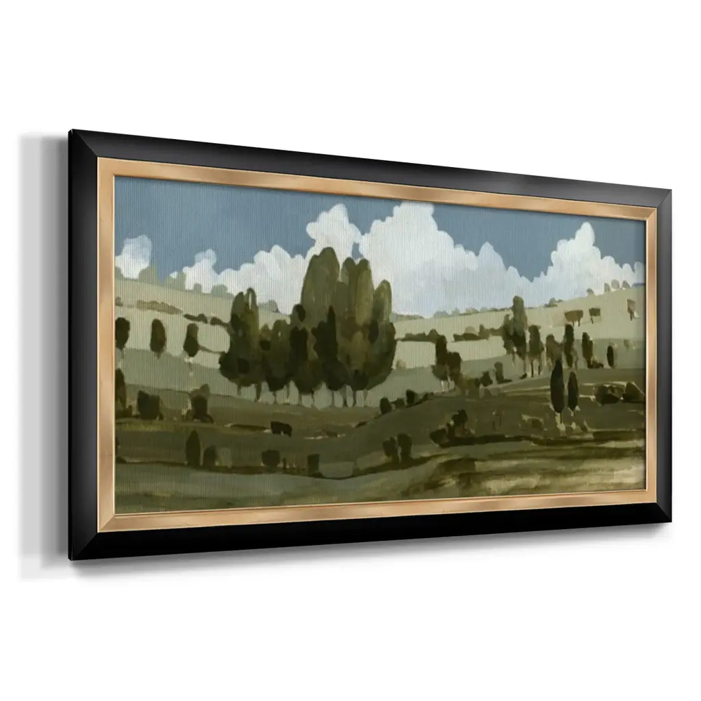 Rolling Green III Premium Framed Canvas- Ready to Hang A Premium Framed Canvas created to last. Framed in distressed wood and available in an array of sizes and colors Featuring a beveled a solid wood stretcher bar, each piece comes ready to hand 3 SIZES AVAILABLE 21''X37'' - Overall Size 25''X45'' - Overall Size 29''x53'' - Overall Size Each piece is made to order. Each piece comes with hanging hardware. Made in the USA Ready to Hang Giclee Paper Print Acrylic Glass Beveled Matt Board