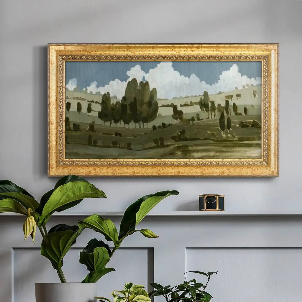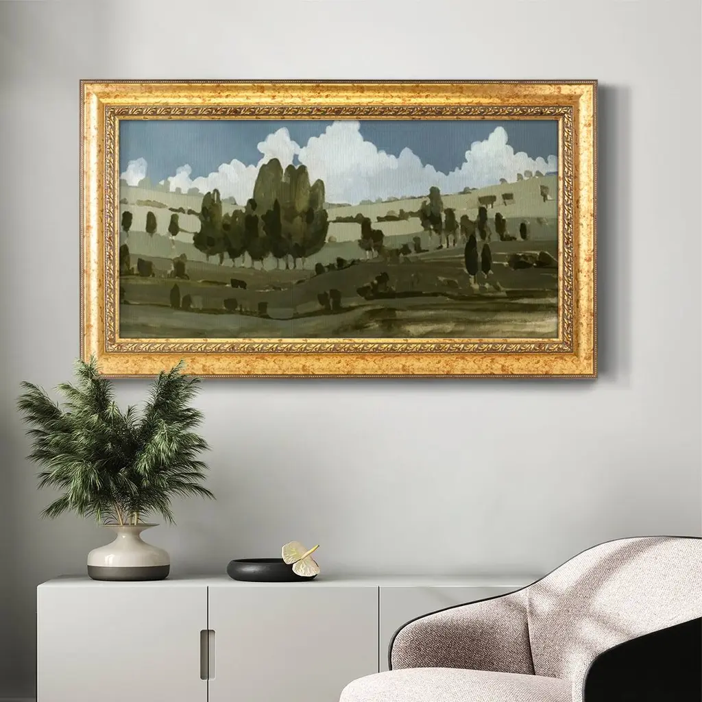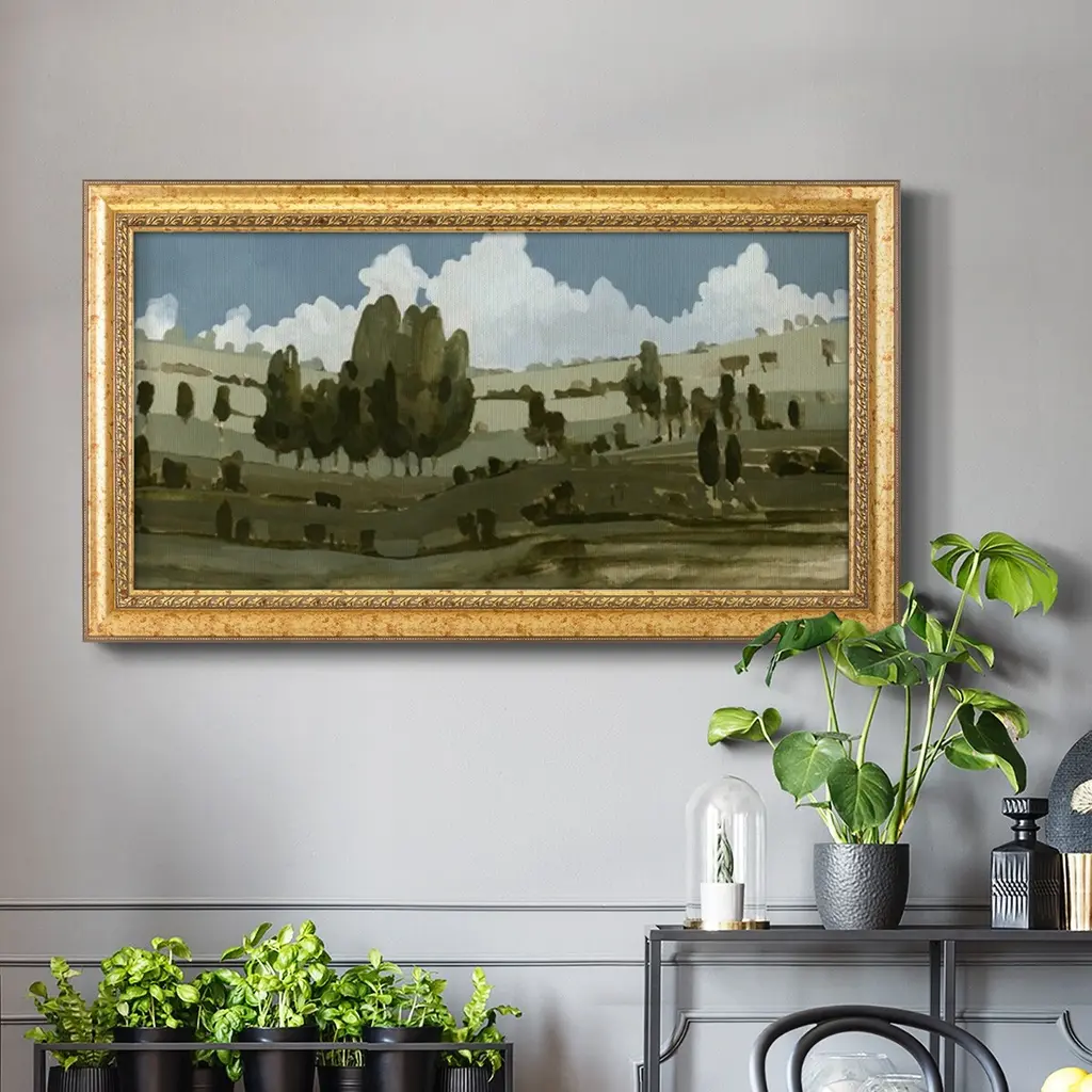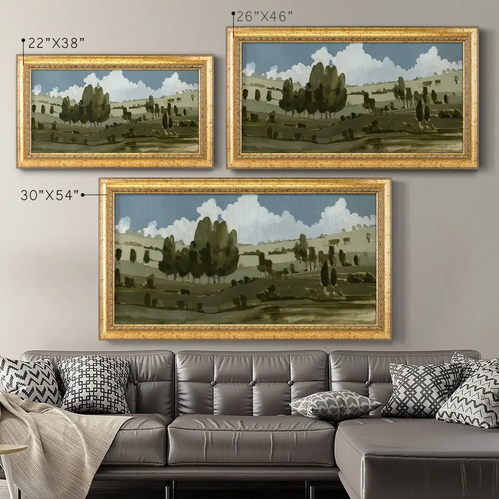 Rolling Green III Premium Framed Canvas- Ready to Hang A Premium Framed Canvas created to last. Framed in distressed wood and available in an array of sizes and colors Featuring a beveled a solid wood stretcher bar, each piece comes ready to hand 3 SIZES AVAILABLE 21''X37'' - Overall Size 25''X45'' - Overall Size 29''x53'' - Overall Size Each piece is made to order. Each piece comes with hanging hardware. Made in the USA Ready to Hang Giclee Paper Print Acrylic Glass Beveled Matt Board