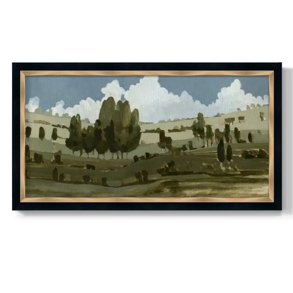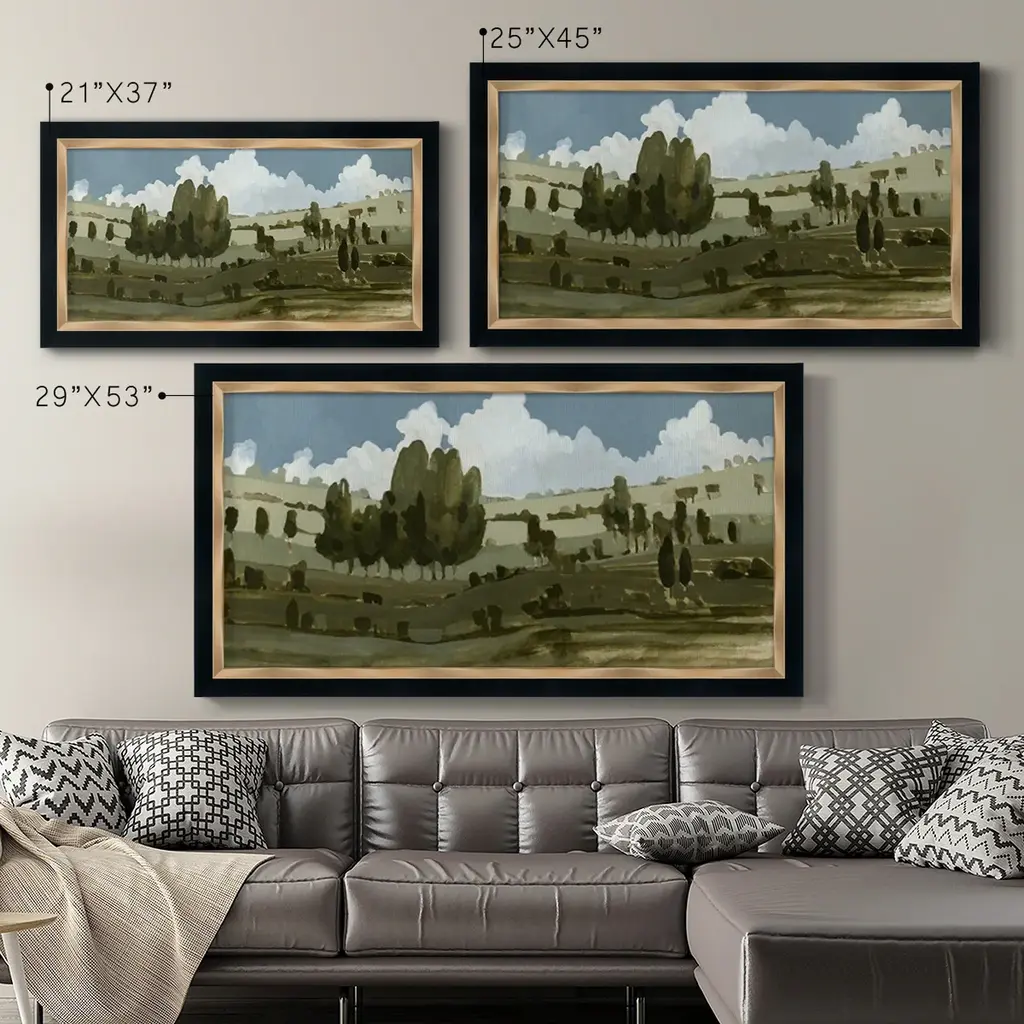 Rolling Green III Premium Framed Canvas- Ready to Hang A Premium Framed Canvas created to last. Framed in distressed wood and available in an array of sizes and colors Featuring a beveled a solid wood stretcher bar, each piece comes ready to hand 3 SIZES AVAILABLE 21''X37'' - Overall Size 25''X45'' - Overall Size 29''x53'' - Overall Size Each piece is made to order. Each piece comes with hanging hardware. Made in the USA Ready to Hang Giclee Paper Print Acrylic Glass Beveled Matt Board